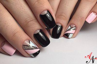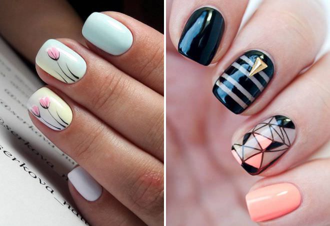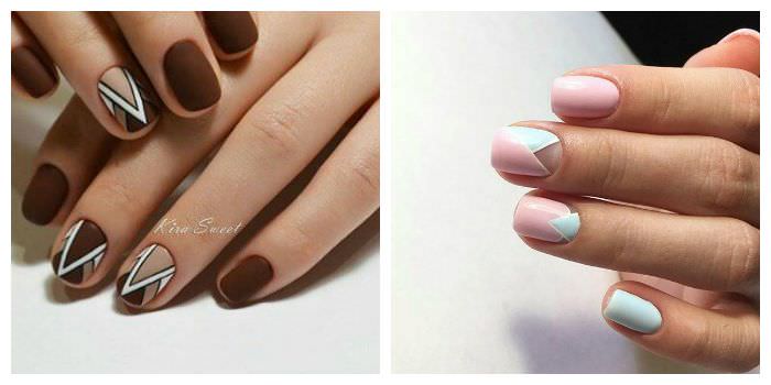 مانيكير عصري للأظافر القصيرة ذات أشكال هندسية مختلفة لأزياء جريئة ومتطورة. مربع أو مثلث بألوان متباينة مختلفة سيعطي مظهراً جميلاً وجمالاً لأظافرك