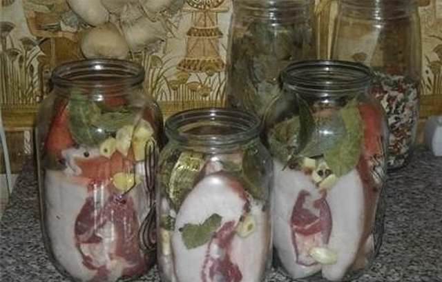 Rinse the fat, dry and cut into pieces, crawling into the neck of a three-liter jar. It is not necessary to lay the lard very tightly, but to lay a bay leaf between the pieces.