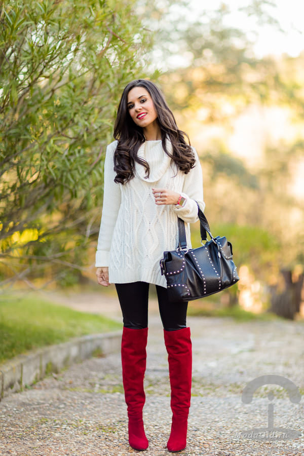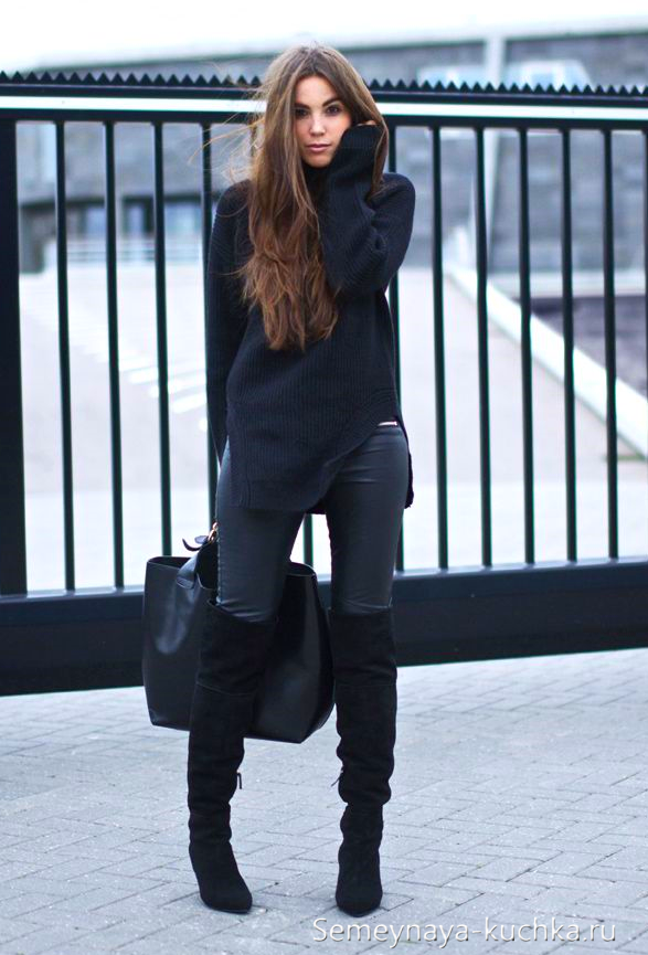 Basically, stocking boots come in leather or suede, with and without heels. They combine perfectly with cropped skirts or dresses, and also look great in combination dresses with a slit. The main shades of this season for this type of boots are: classic black and brown, berry shades, light colors for special occasions.