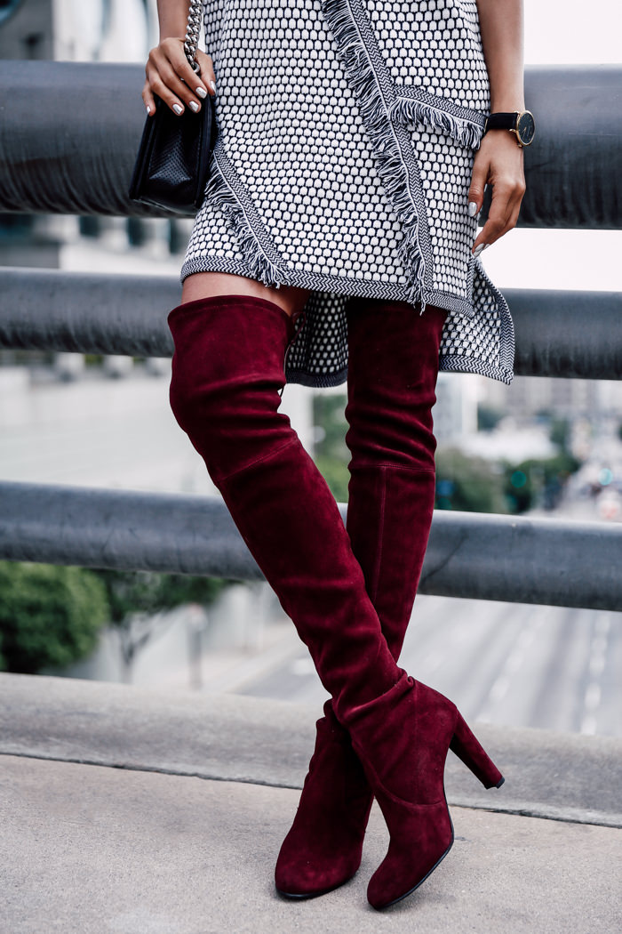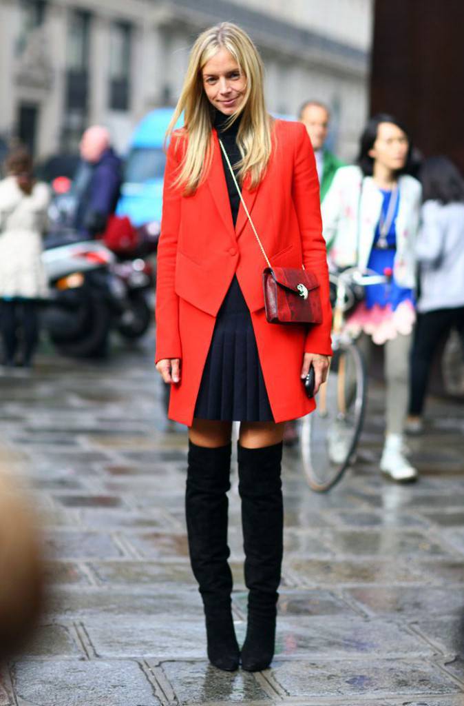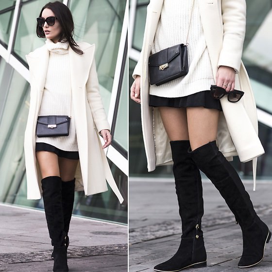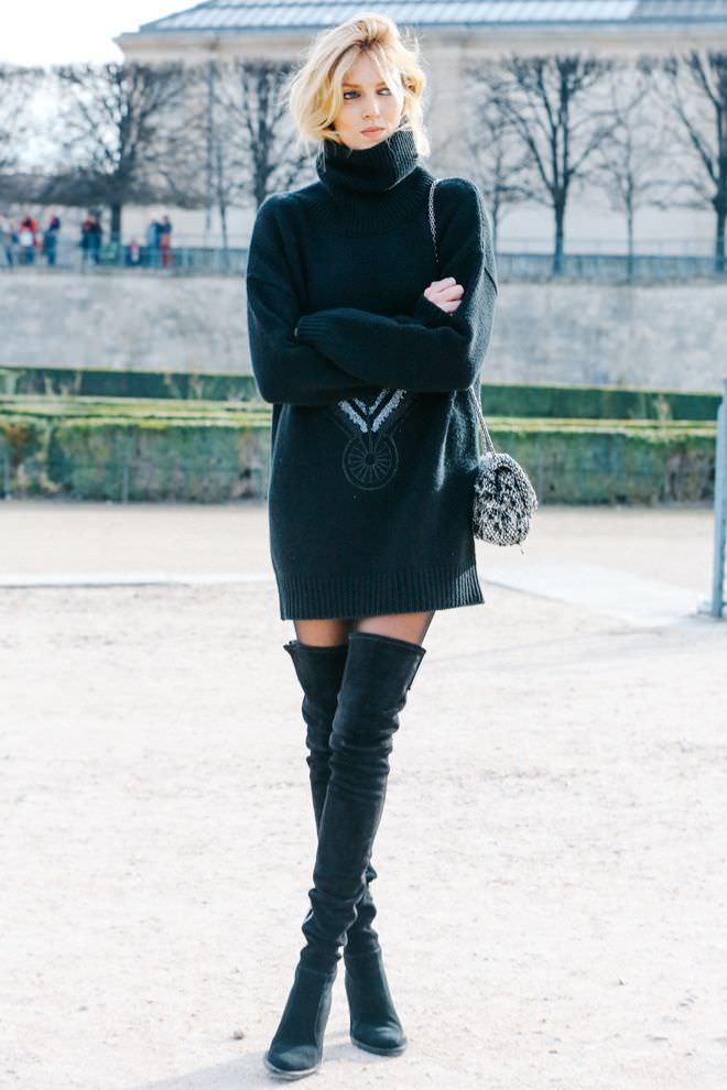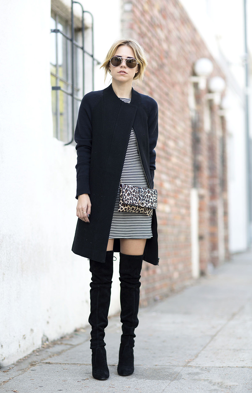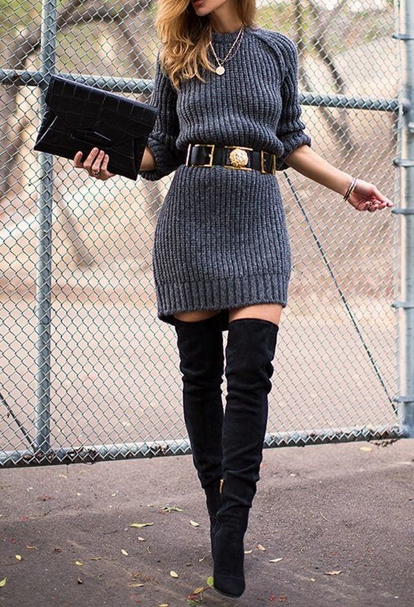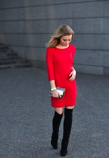 To create a more classic look, a small sheath dress in combination with suede stocking boots are perfect.