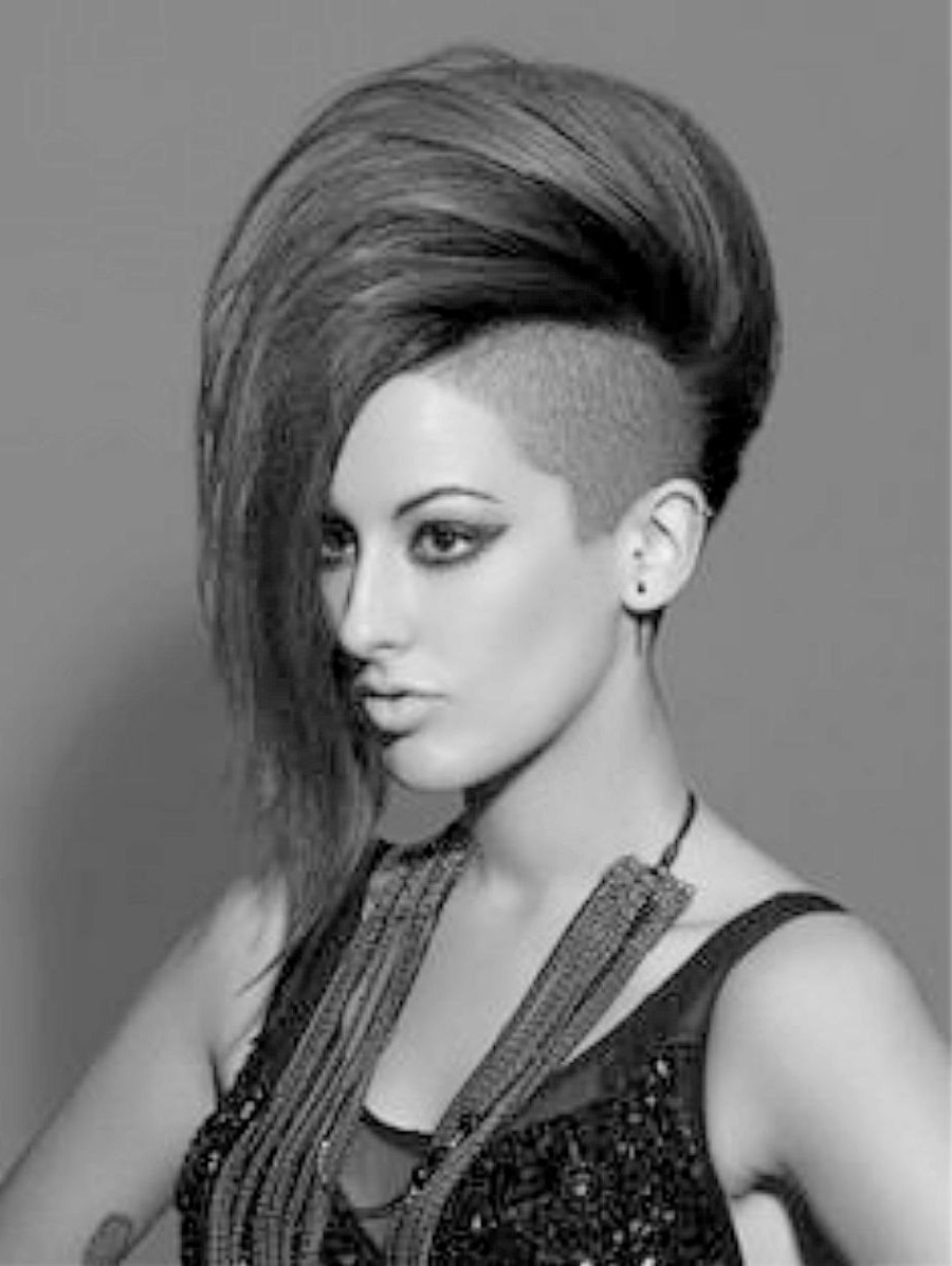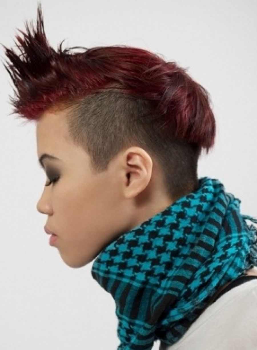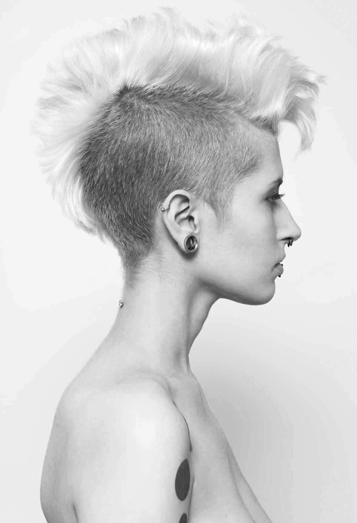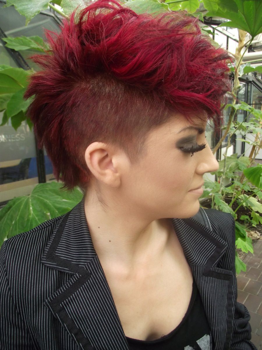 The classic version of the female Iroquois is a rather narrow and even strip of hair at the crown. The hair on the sides of this strip is either completely shaved or is cut pretty short. Stacked classic Iroquois in the form of a protruding scallop.