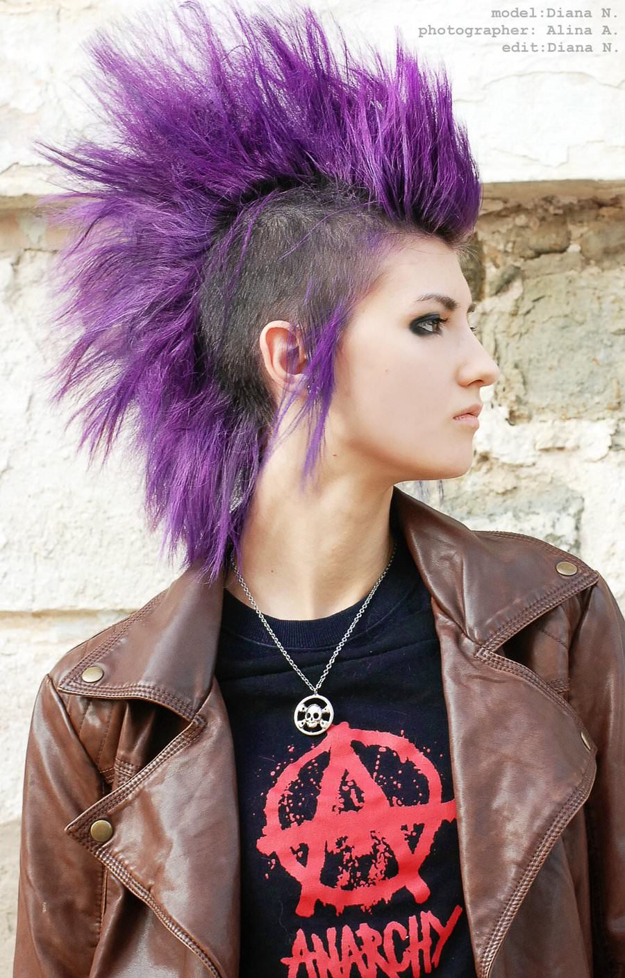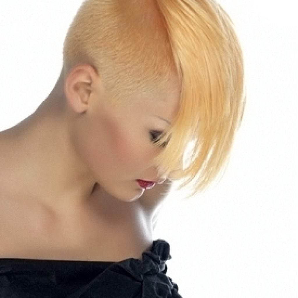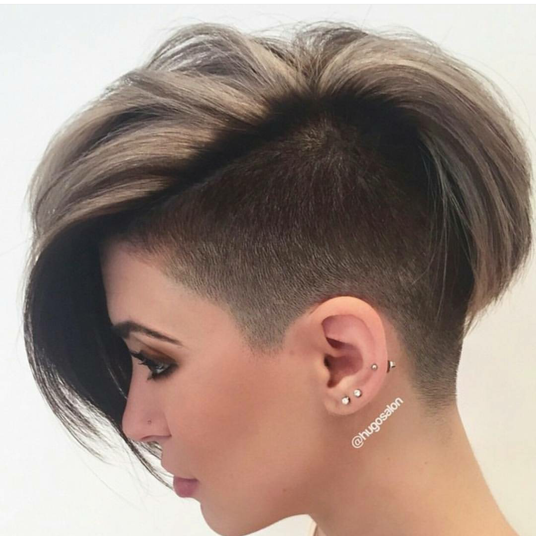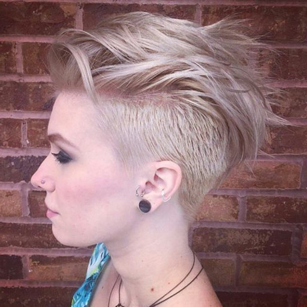 The classic version of the female Iroquois is a rather narrow and even strip of hair at the crown. The hair on the sides of this strip is either completely shaved or is cut pretty short. Stacked classic Iroquois in the form of a protruding scallop.