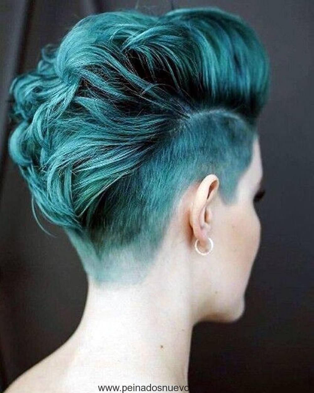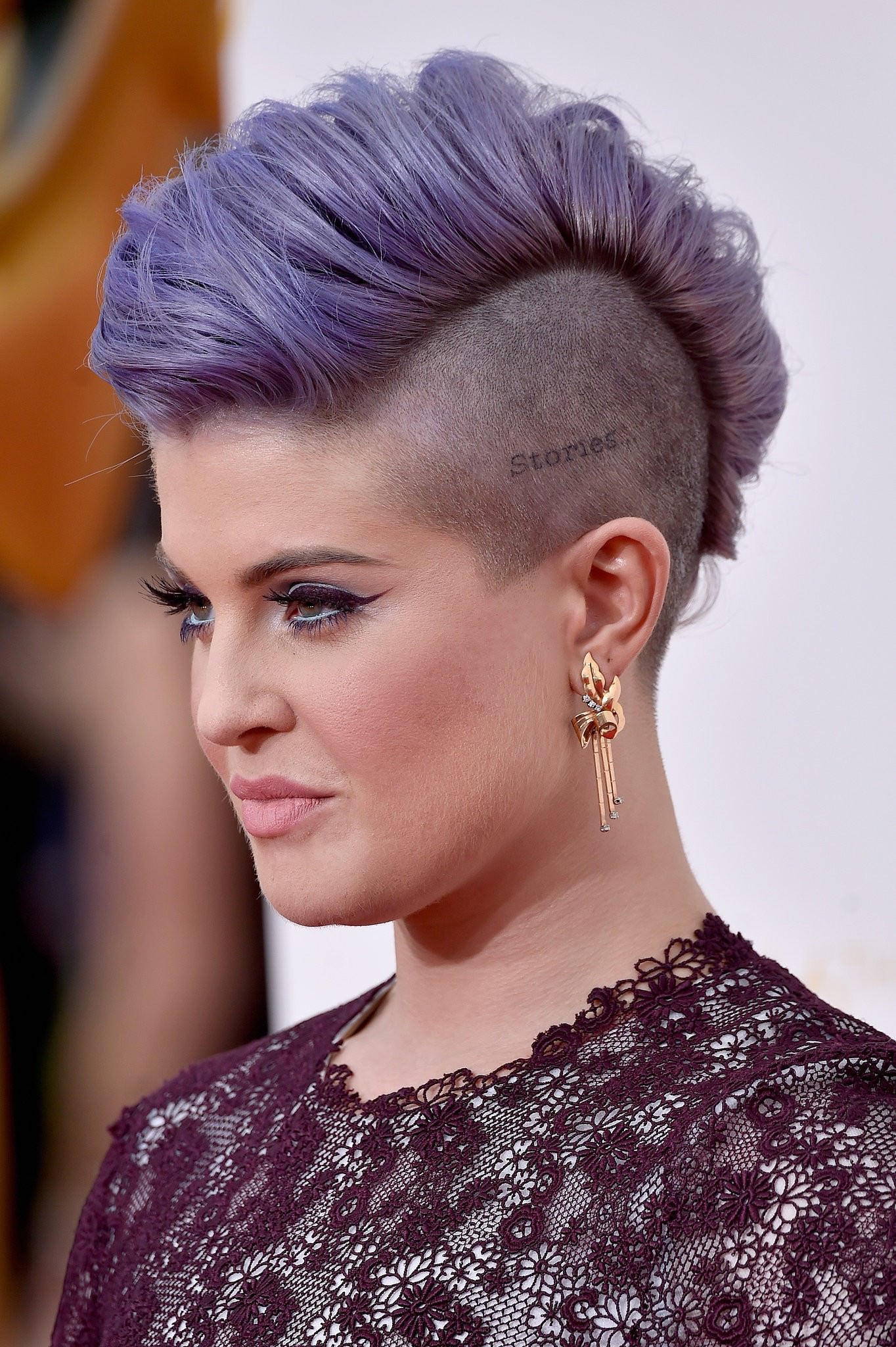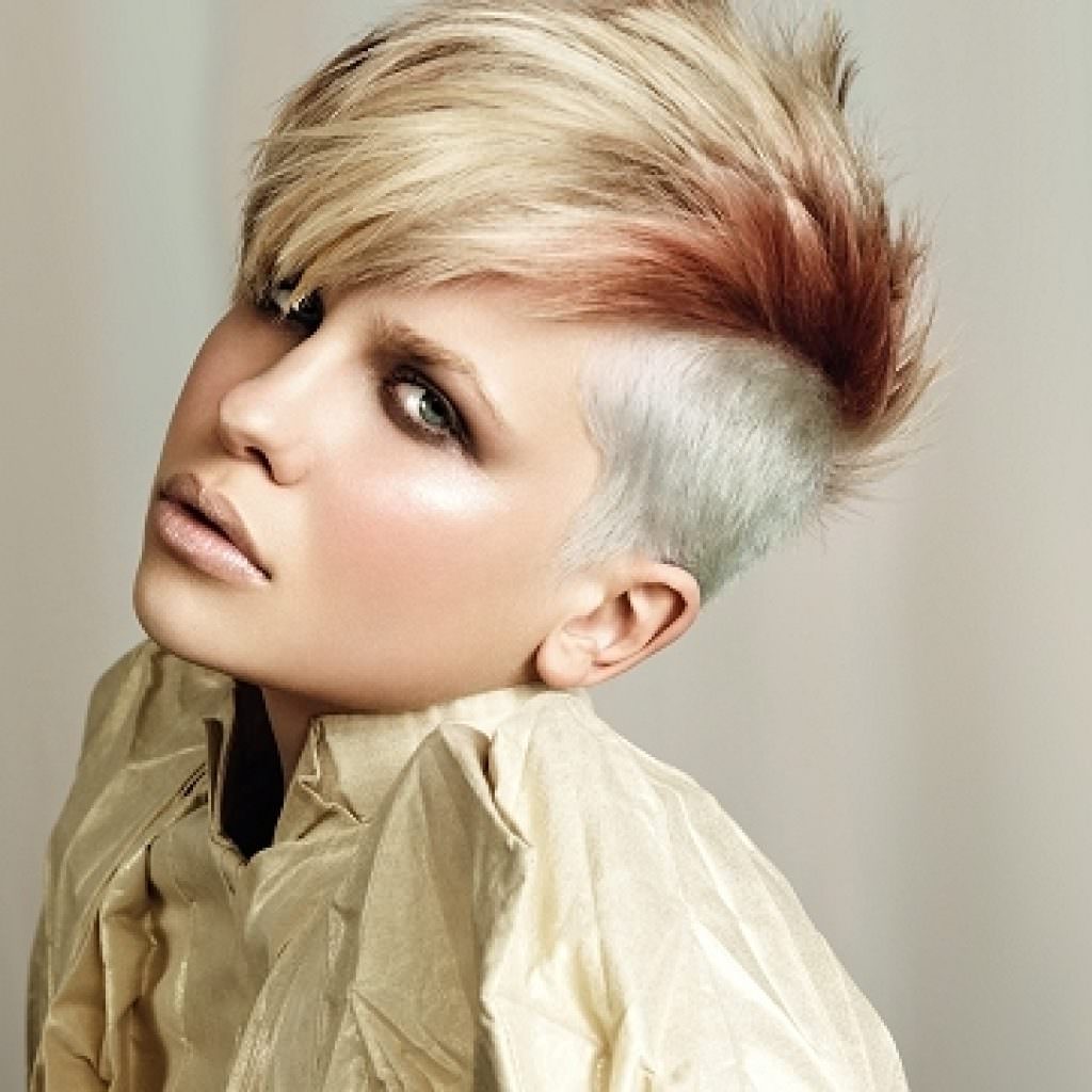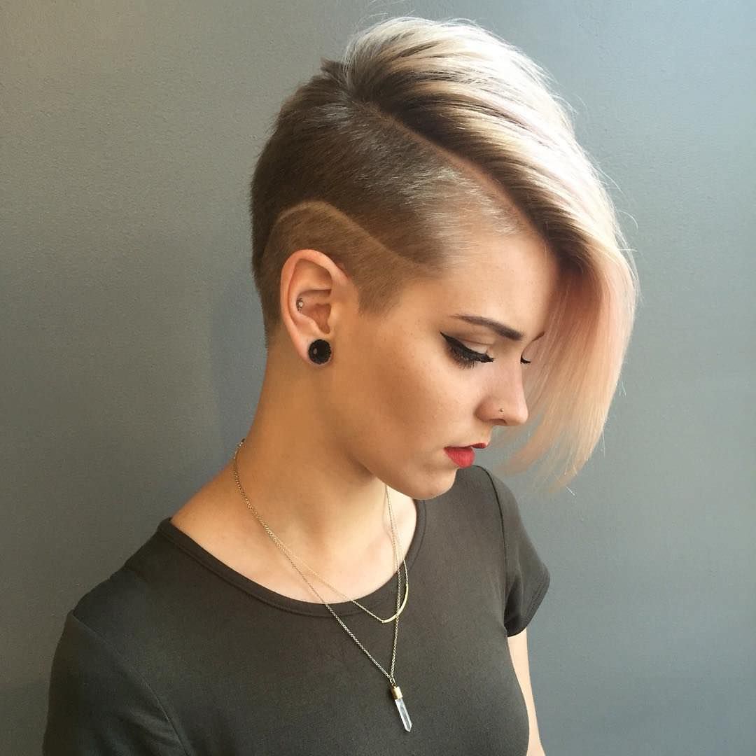 The classic version of the female Iroquois is a rather narrow and even strip of hair at the crown. The hair on the sides of this strip is either completely shaved or is cut pretty short. Stacked classic Iroquois in the form of a protruding scallop.
