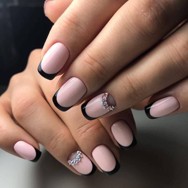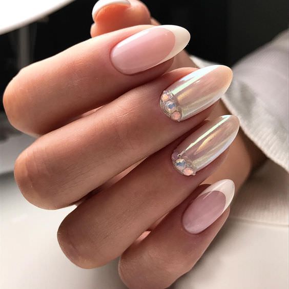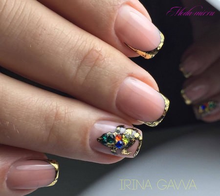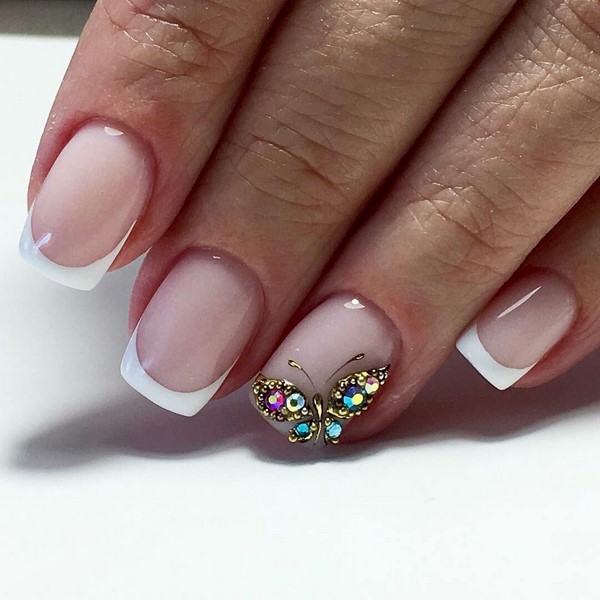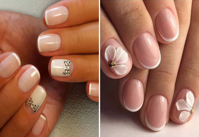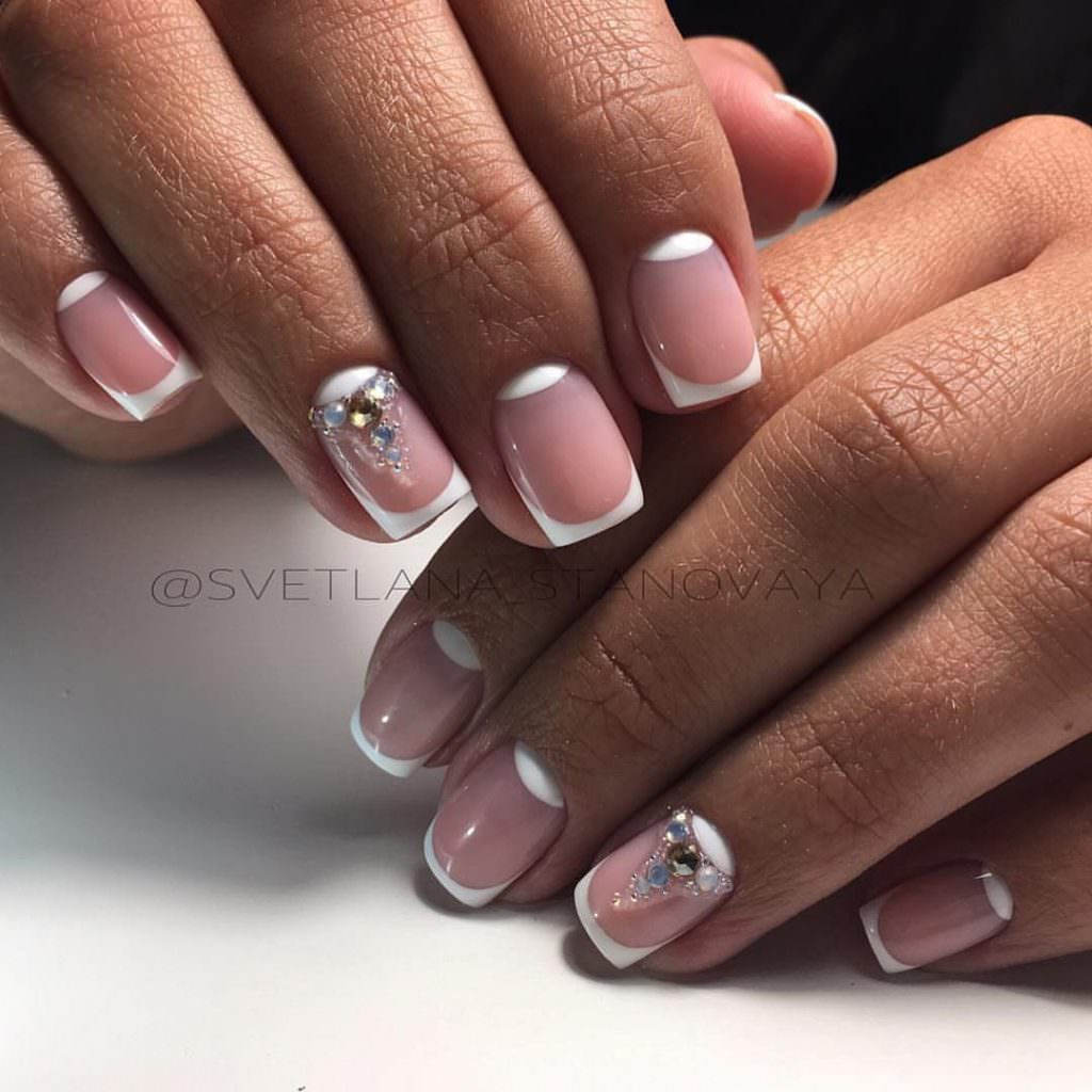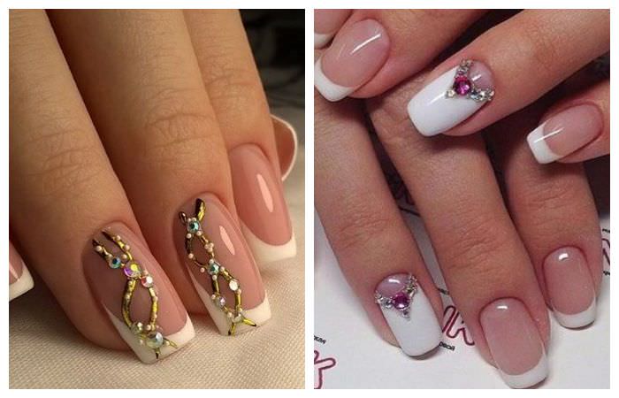 If you want a chic and memorable manicure, decorate your jacket with pebbles or sparkles, this will be a very beautiful French nail design. But you need to remember the main rule of the service jacket is gentle femininity, rhinestones or sparkles should be in moderation so that there is no busting. It will be enough to decorate one nail, if all the nails are decorated with stones it will be a vulgar tastelessness.