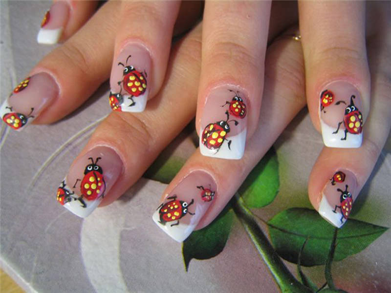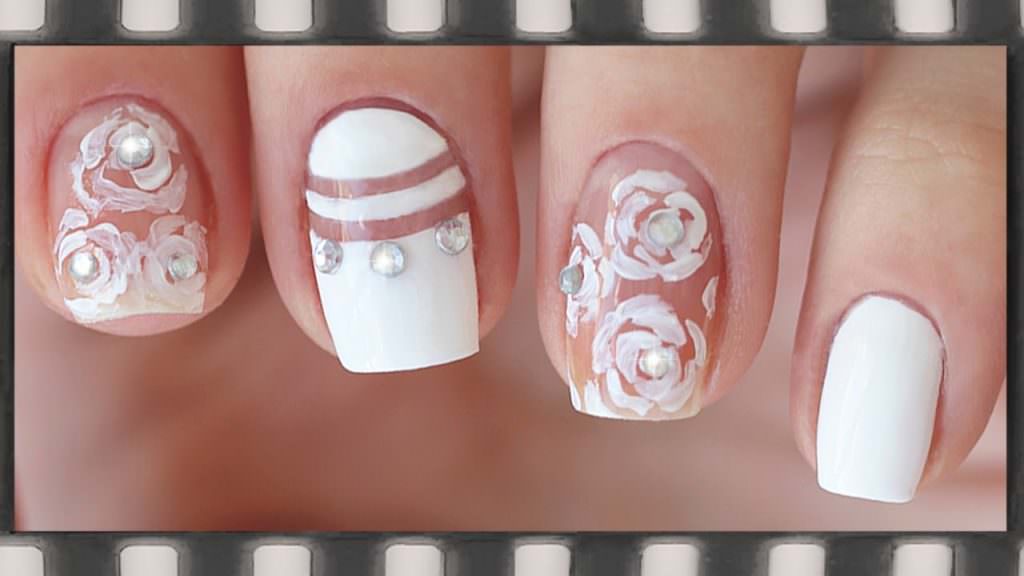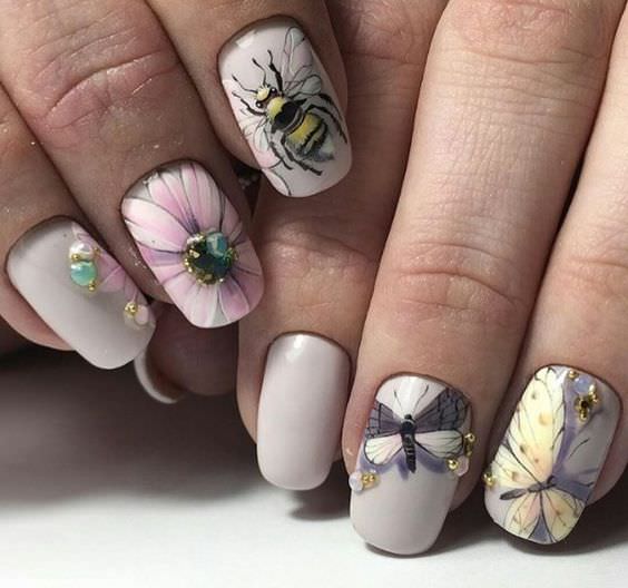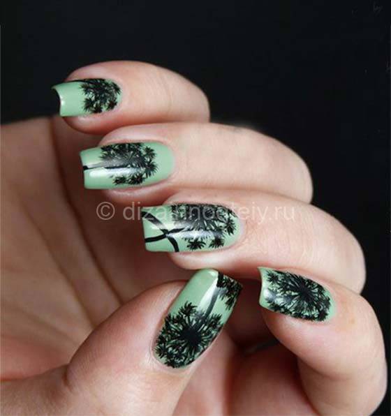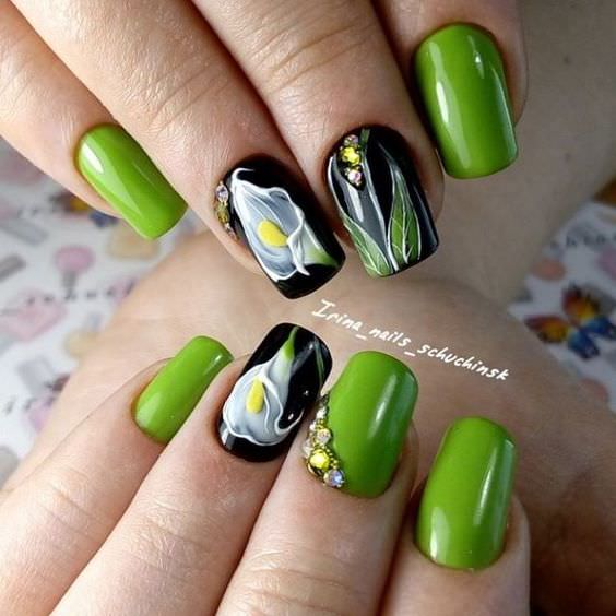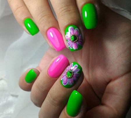 Minimalism is fashionable: small buds of roses or miniature daisies. The design of such a manicure looks gentle and beautiful. If there is no time for watercolor paintings, the beauty of the nails can be glued. This year, bright green leaves on a white background are very fashionable on swimsuits, dresses, skirts. A juicy green print on the nails will also come in handy.