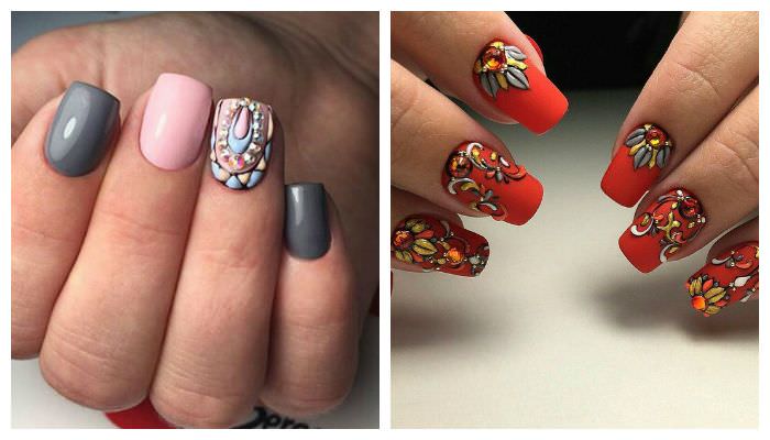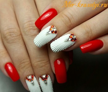 Bright new year with an unusual color design of nails. This manicure is distinguished by both the technique of execution and the style of the drawing. A complex embodiment can only be done by an experienced master. Different shades of gel polish, acrylic powder - as a result, an interesting three-dimensional drawing.