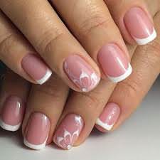 In summer manicure, an unusual design of French manicure is also preferred. It is not necessary to adhere to the classics, the edging line can be oblique, bend, or begin with half a marigold. The main thing to remember is that bright colors and colors are in fashion this summer. One of the designs, when the pink smile of the jacket is decorated with a delicate pattern of white lace, which will unusually decorate your hands with tenderness.