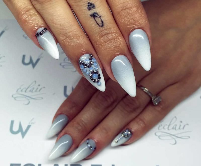 Blurry shades can be decorated with rhinestones, preferably small ones and placed on the edge of the hole or diagonally.