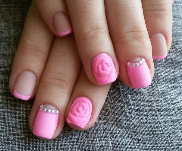 Pink color in a special way, emphasizes the beauty of the popular matte manicure, makes it more expressive. Nails covered with a pink matte gel polish remind the tenderness of velvet. Selecting the ends of the nails with the help of a glossy gel polish - we get a delicate elegant jacket. Gorgeous manicure can be obtained by decorating the matte surface with glossy patterns. Patterns in color may coincide with a shade of pink manicure, and may be in darker colors. Using acrylic powder, you can make a volumetric pattern, emphasizing the beauty of a luxurious matte finish.