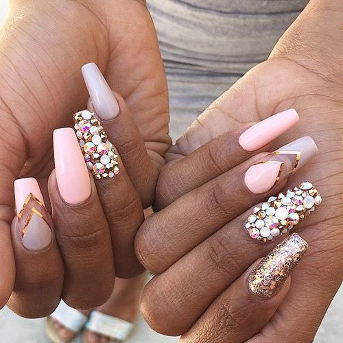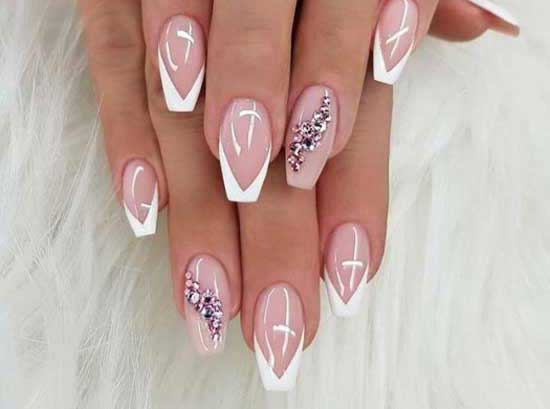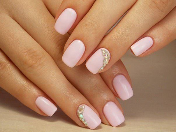 Luxurious pink manicure gel polish, we get by decorating it with rhinestones. A manicure with rhinestones should be elegant, the main thing is not to overdo it with the amount of rhinestones. This can be a small ornament, or a decorated hole on one finger.