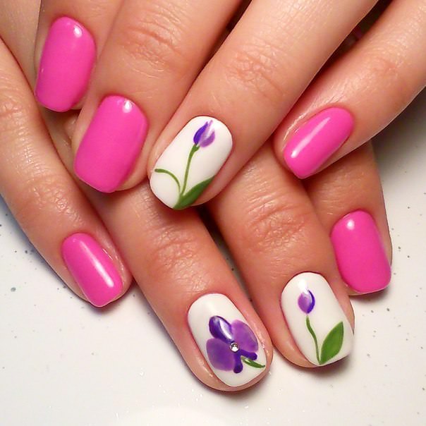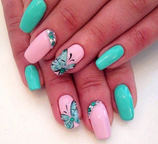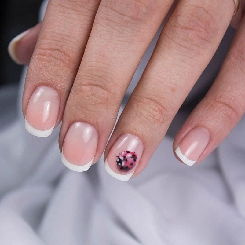 The base coat of a bright manicure will be beautiful pink gel polish. Pink manicure is suitable for any spring-summer light and provocative look, decorated with the decor of a dragonfly, butterfly or ladybug. Decorating the nails with an ornament or pattern, you get a fashionable evening manicure.