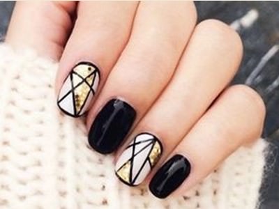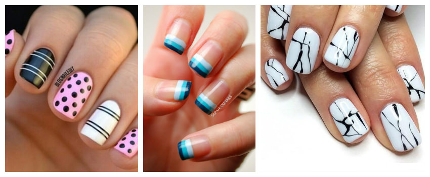 For short nails, strips on a manicure gel polish are relevant. They can be vertical or horizontal, can be in any direction. Stripe geometry patterns look original.