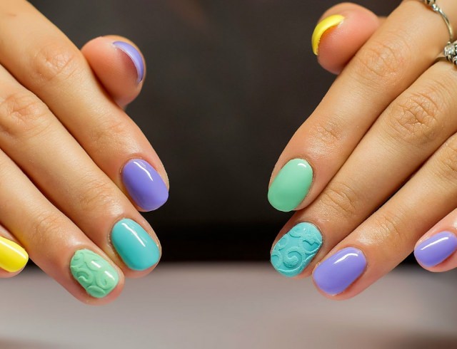 Thanks to a wide palette of gel polishes, nails can be made in different shades. For such a manicure, there are many options. Ombre and holography are in great demand, with different shades on each nail.