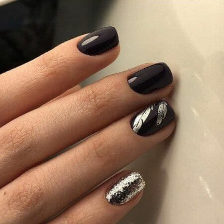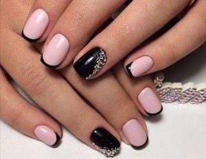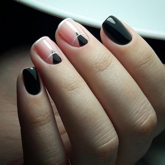 Reverse jacket or moon manicure will not only decorate short nails, but also visually lengthen them, especially if it is done in rich colors. The classic version of black and white, especially popular on short nails, with different options for the hole at the base.