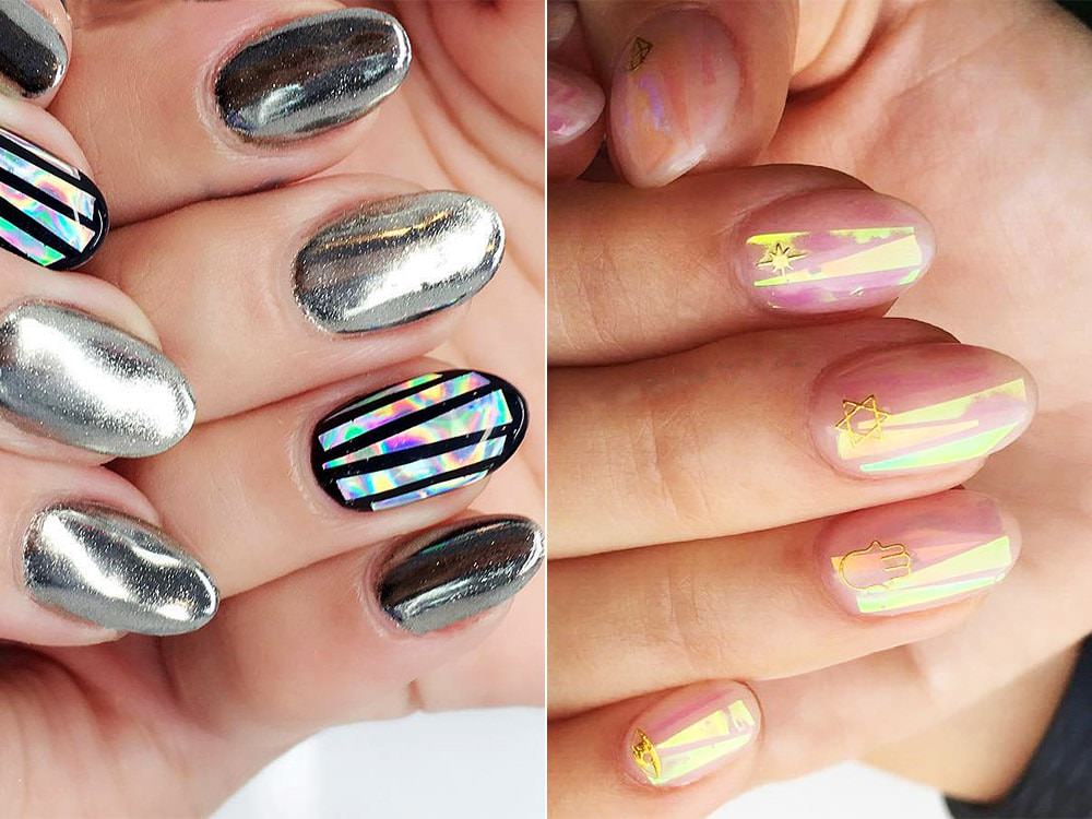 It is performed using foil, mica, sparkles. A simpler option is to use a shiny gel polish. The manicure looks like a gel polish of a single color, with shiny polish highlighted with two fingers.