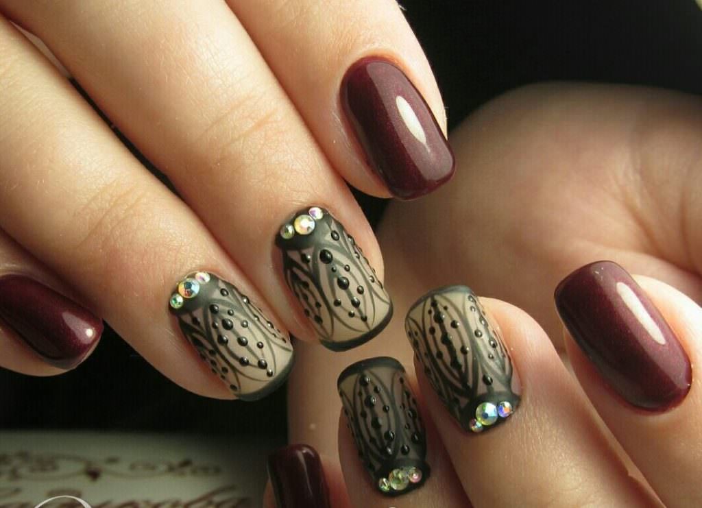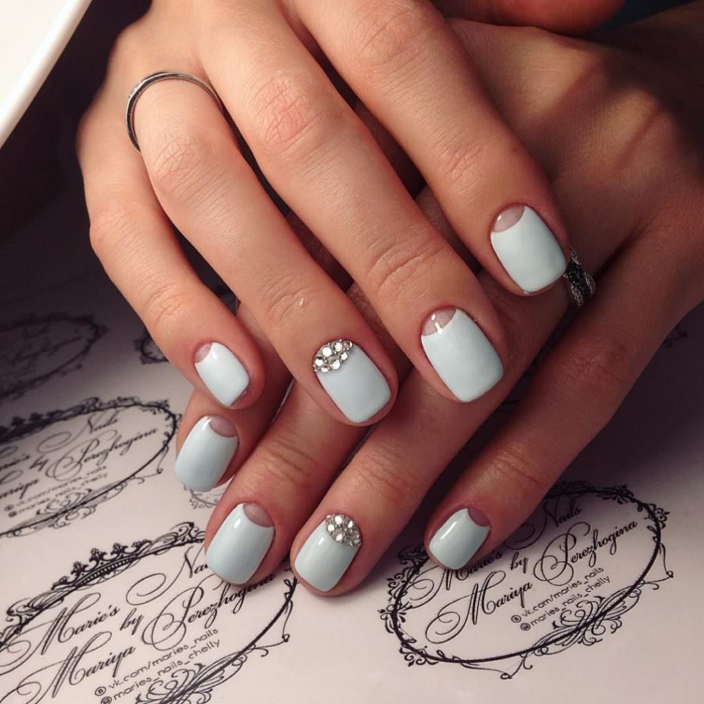 A casual manicure with rhinestones for short nails will look best in pastel colors. For evening manicure, you can use a shade of bright red, burgundy, black. Rhinestones on a deep blue varnish, noble chocolate look universally and exquisitely, younger girls can use brighter colors.