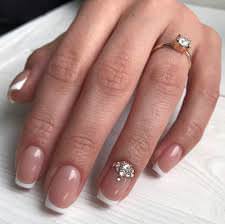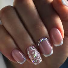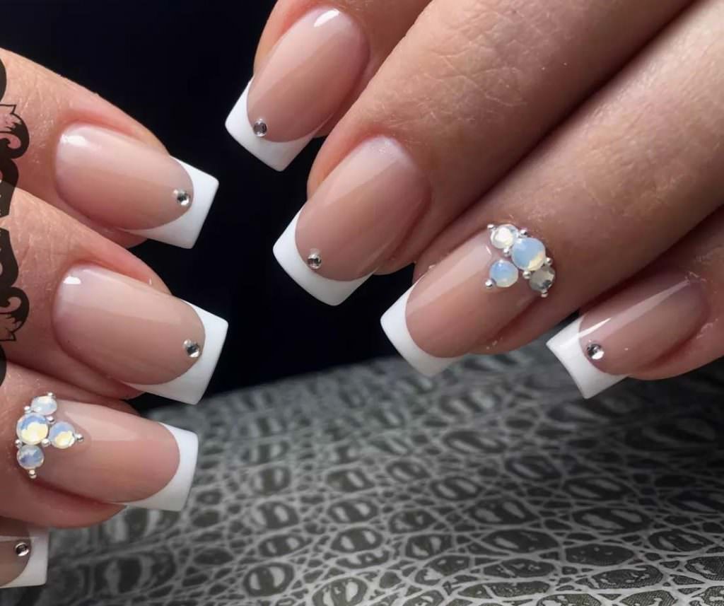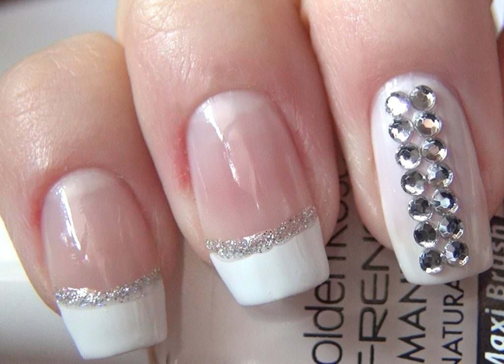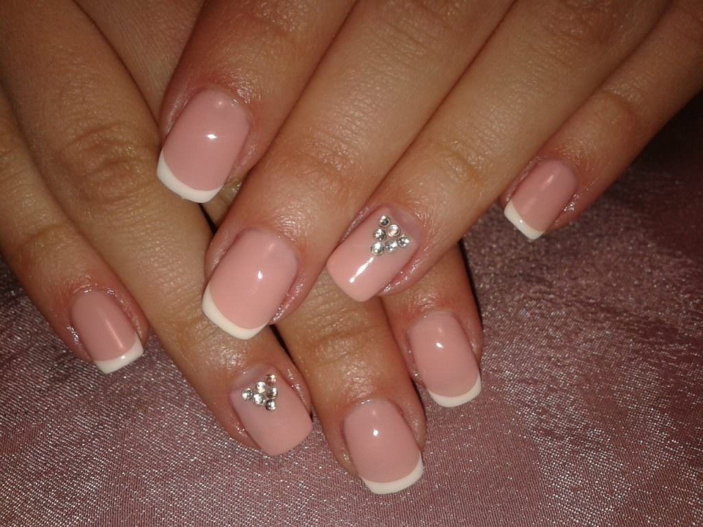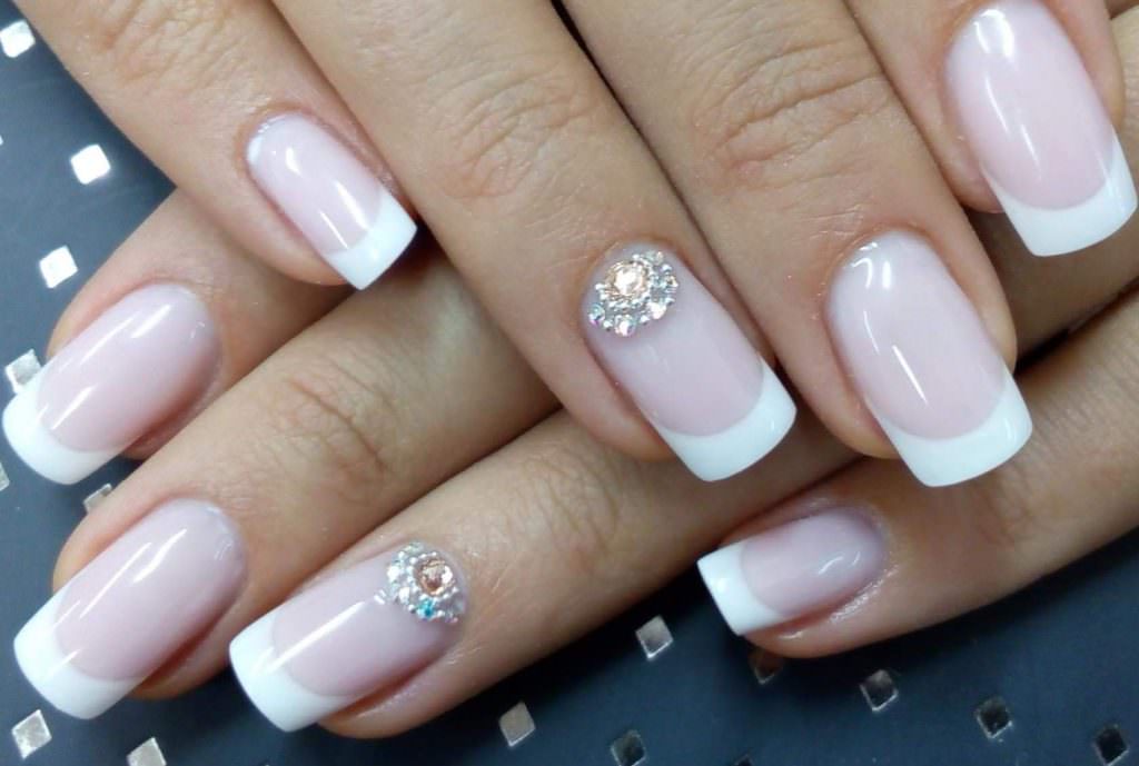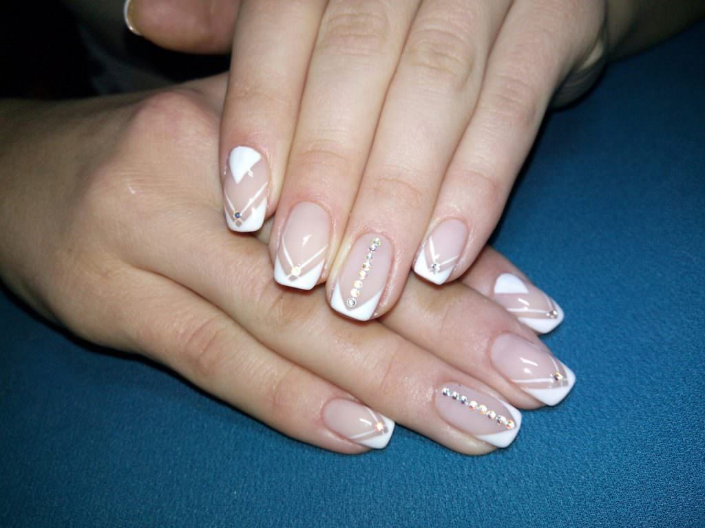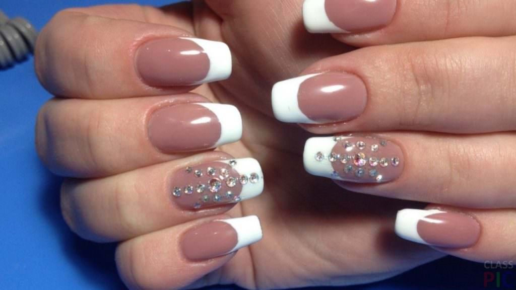 French is always relevant, and a note of rhinestones will give it a touch of novelty. A smile can be thin, one strassik wide, or it can be two or three rows. You can modify the smile by making a slope or a non-standard shape with pebbles of different diameters.