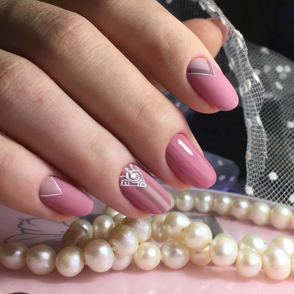 An elegantly stylish look with a matte oval manicure will give a brilliant decor: rhinestones, sequins or adhesive tape. The matte surface can be decorated with glossy patterns.