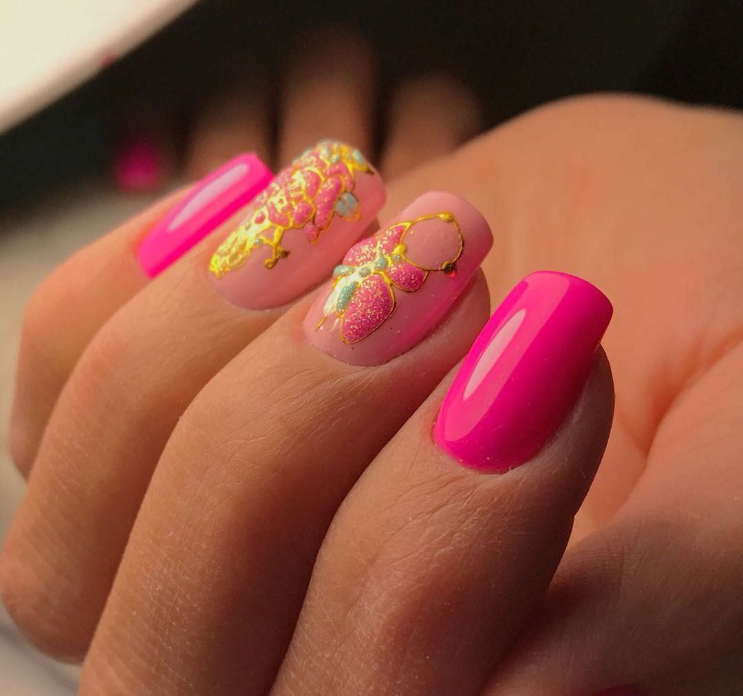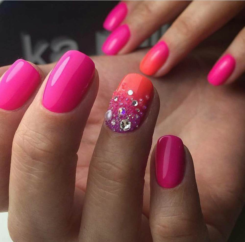 For bright girls, always living on the positive, the ideal option is bright pink, even a little flashy color. This shade creates a summer mood at any time of the year. Skillfully decorating it with various elements or playing with various techniques, you can create a real masterpiece of manicure art.