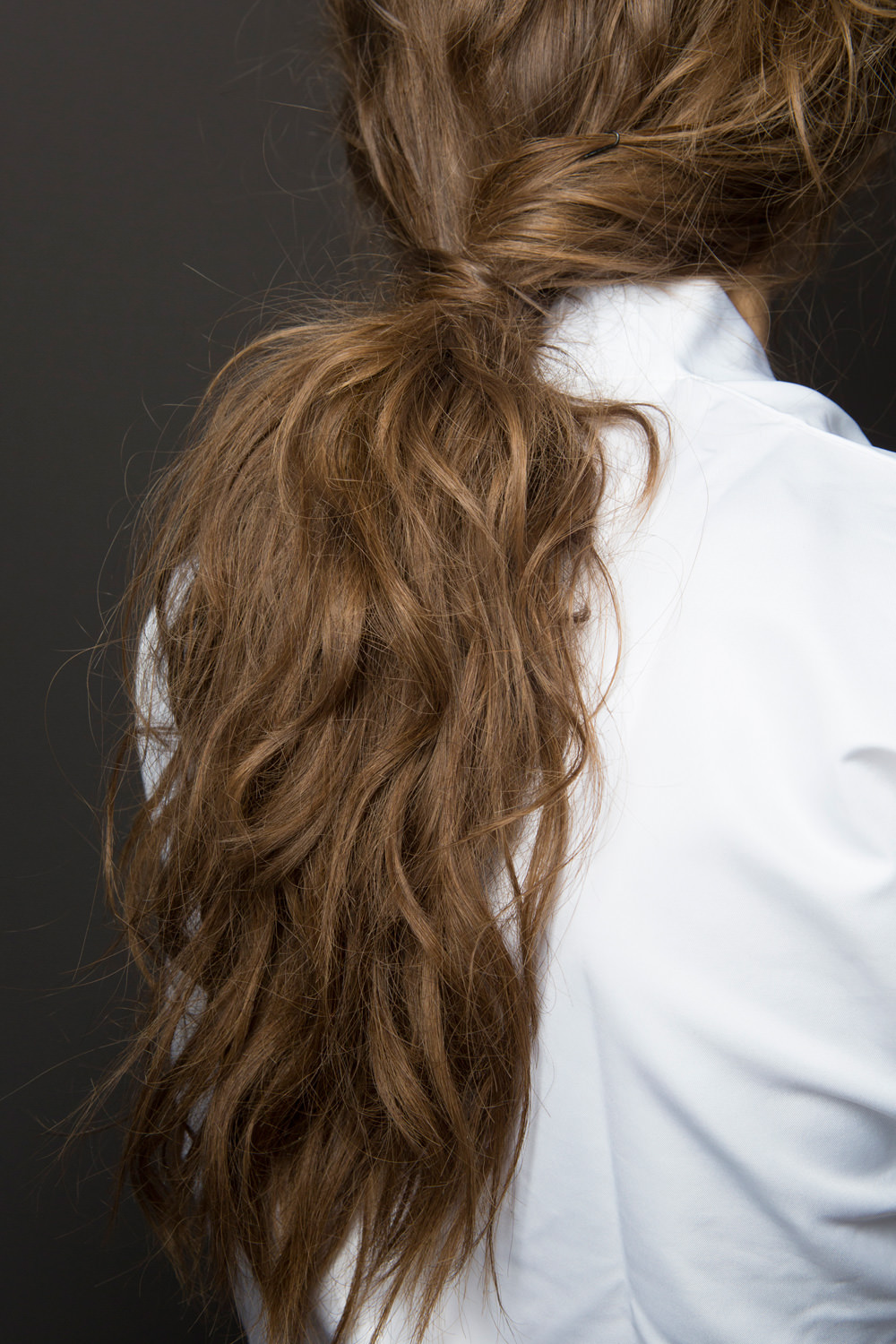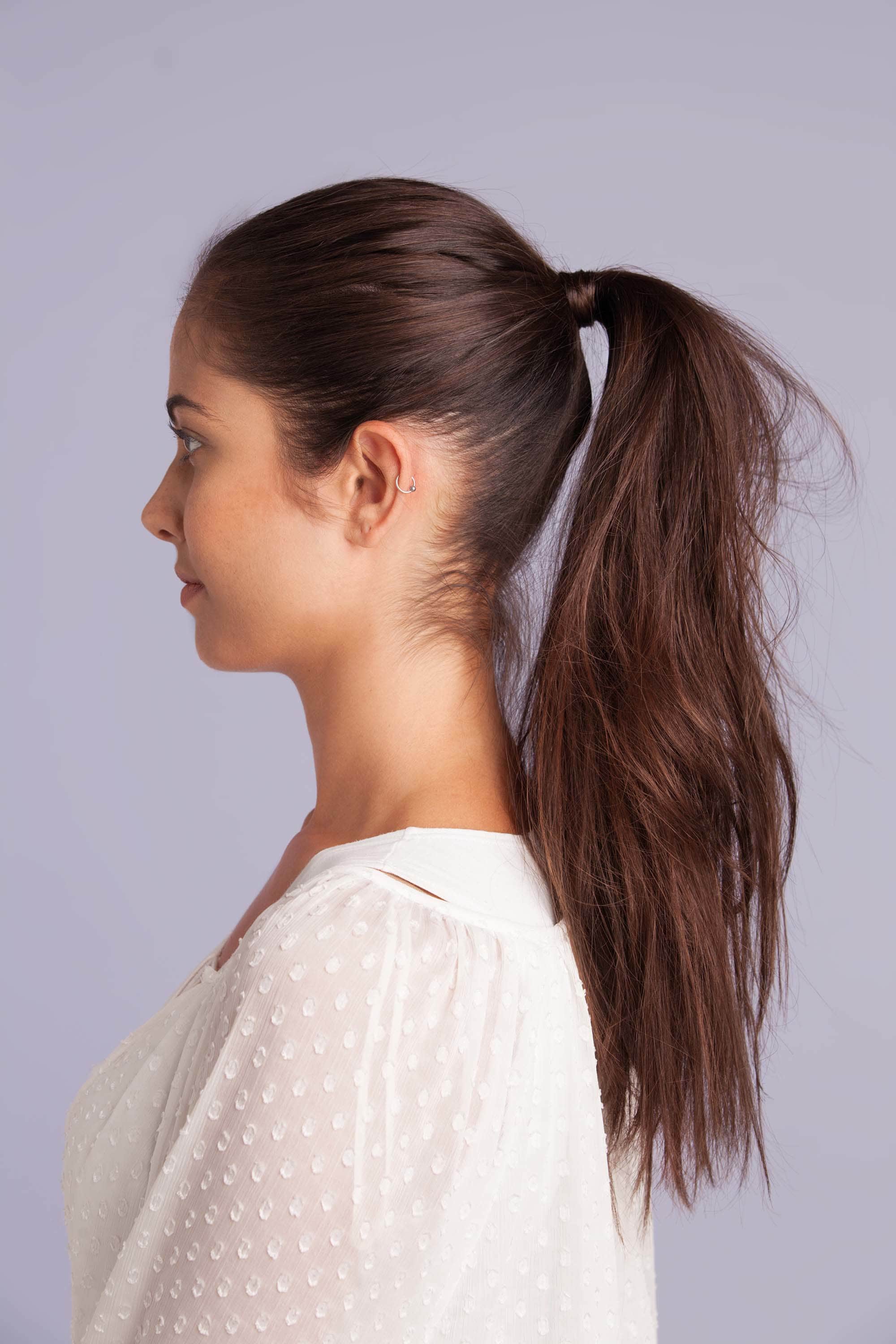 - Gather a regular tail. Then pass the tail through the “donut” hole in the same way as through the rubber band.
