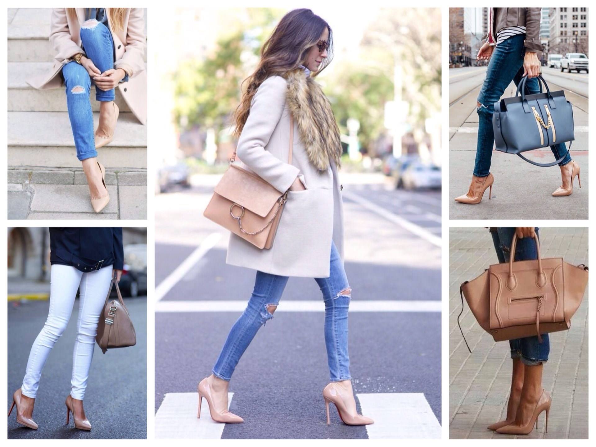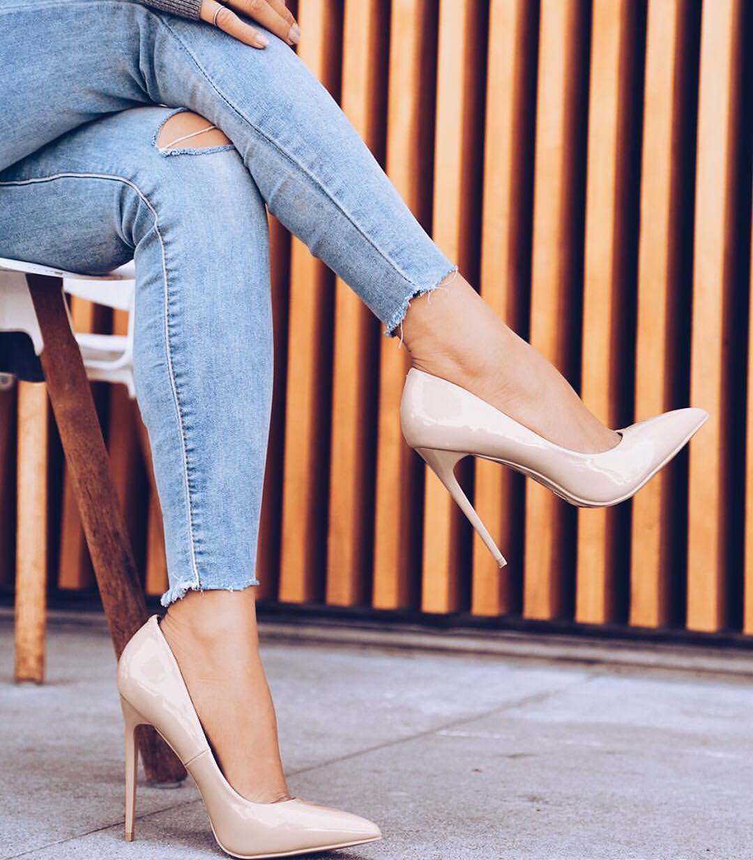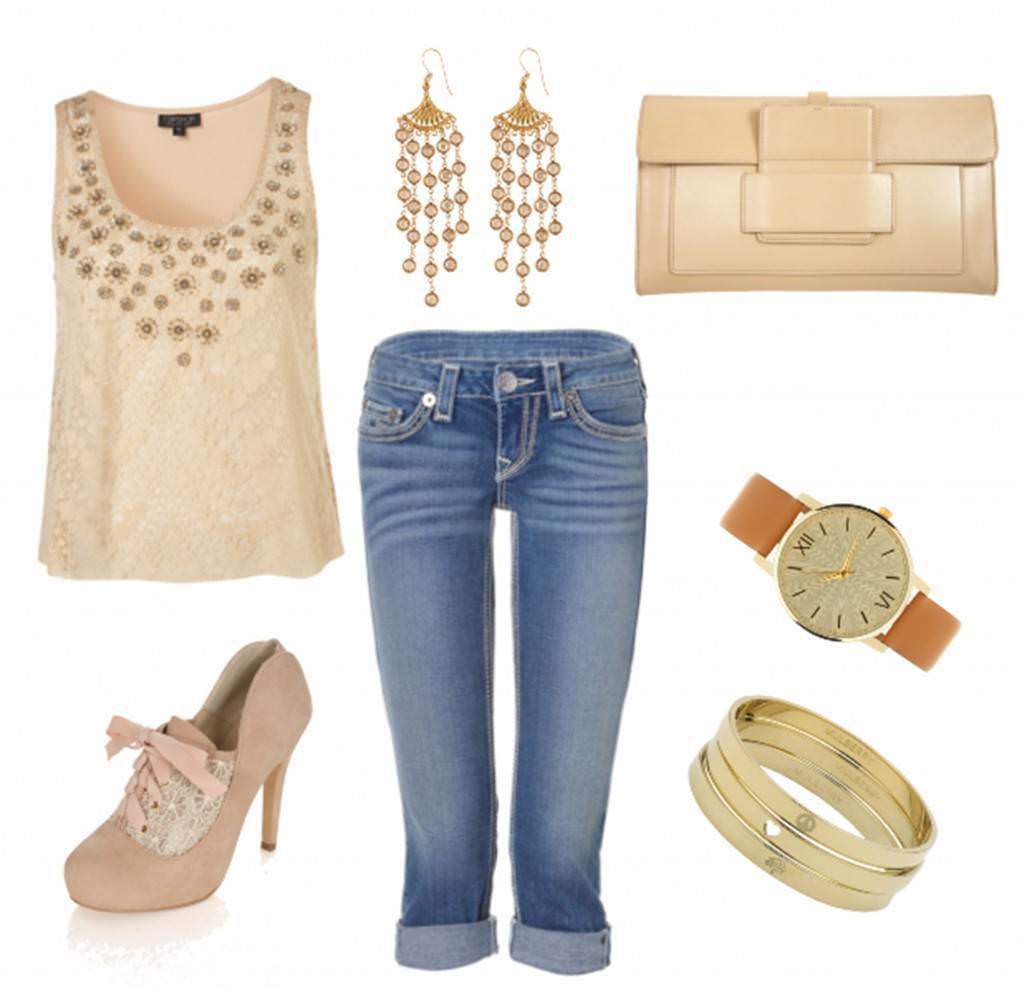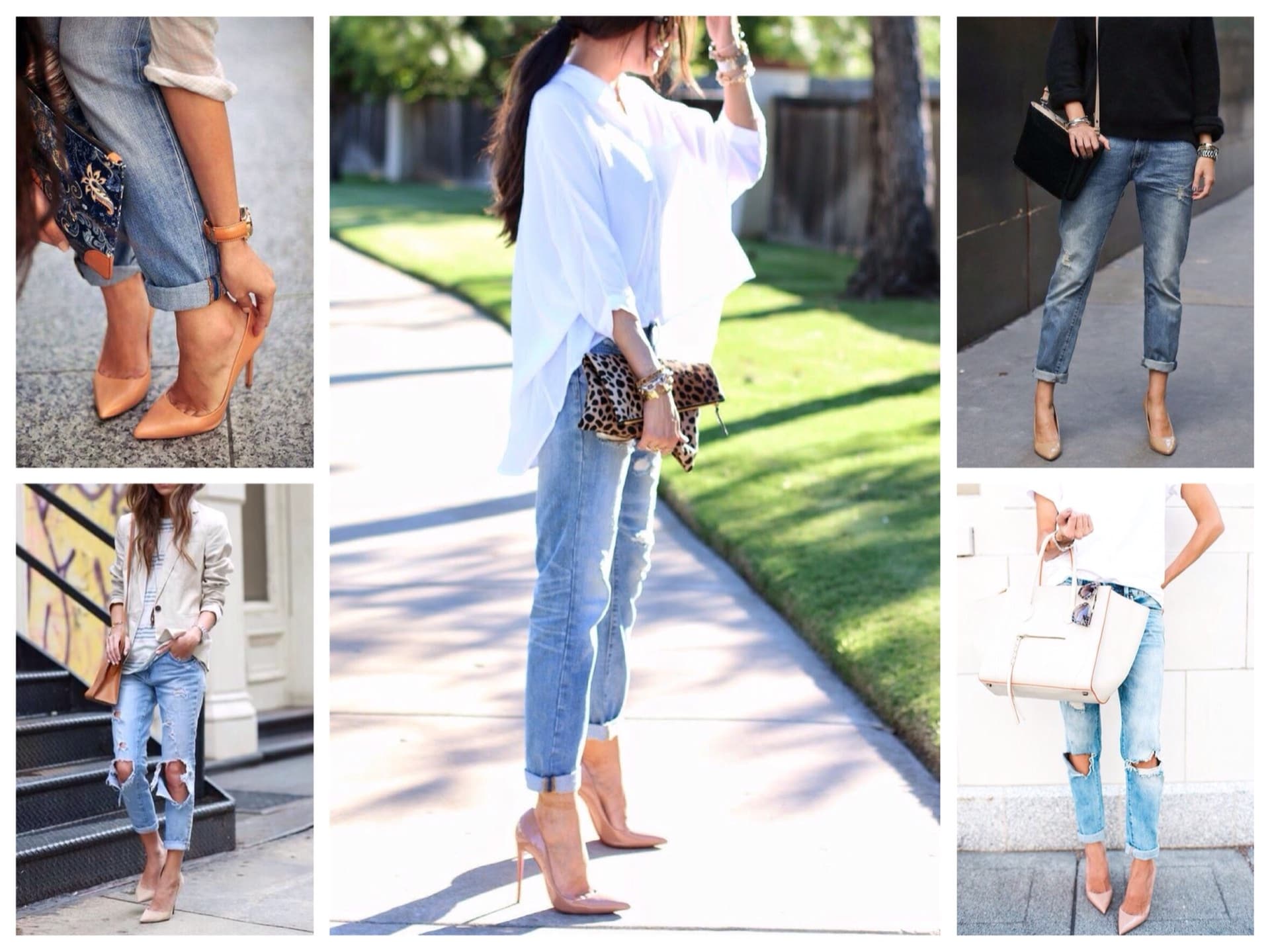 Beige heeled shoes look great with skinny jeans and a light blouse with a cardigan. In general, jeans can be of almost any style, the main thing is that they fit well on the figure.