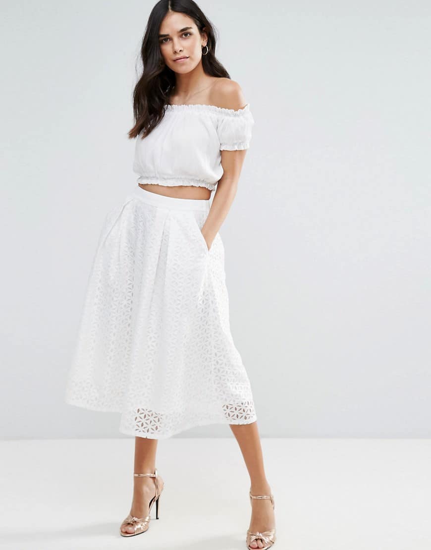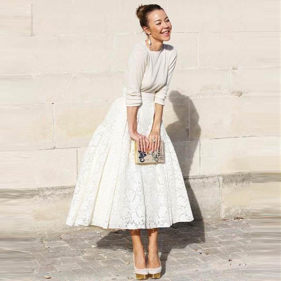 A midi skirt is a versatile option that you can wear both for an evening reception and for a walk in the park. For a festive look, go for a combination with a lace top and a voluminous white midi skirt. The color of the top can be absolutely anything. For a more romantic and everyday option, a light blouse is suitable. If you want to create an image in the style of an art house, choose a light top and jeans in combination with sneakers.