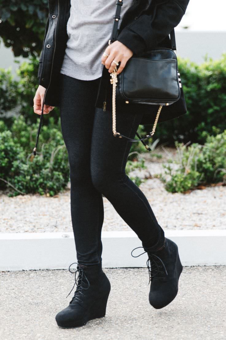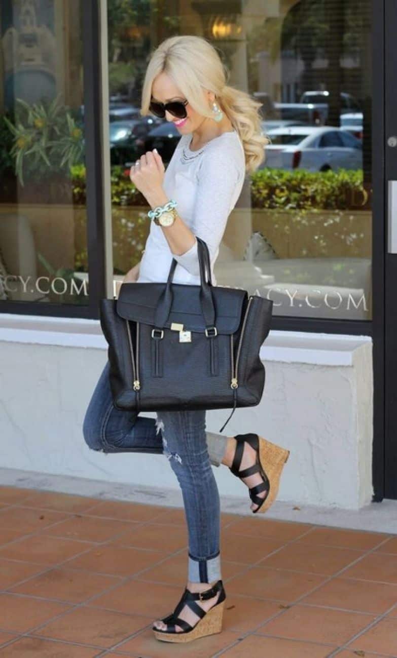 Do not forget that in addition to wedge sandals, there are also various options for winter and autumn shoes. When forming such sets, it is important to correctly balance the image. That is the choice of black boots and tight jeans, accessories and top sets should be in tone boots.