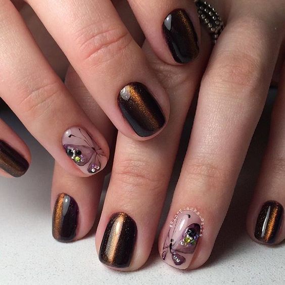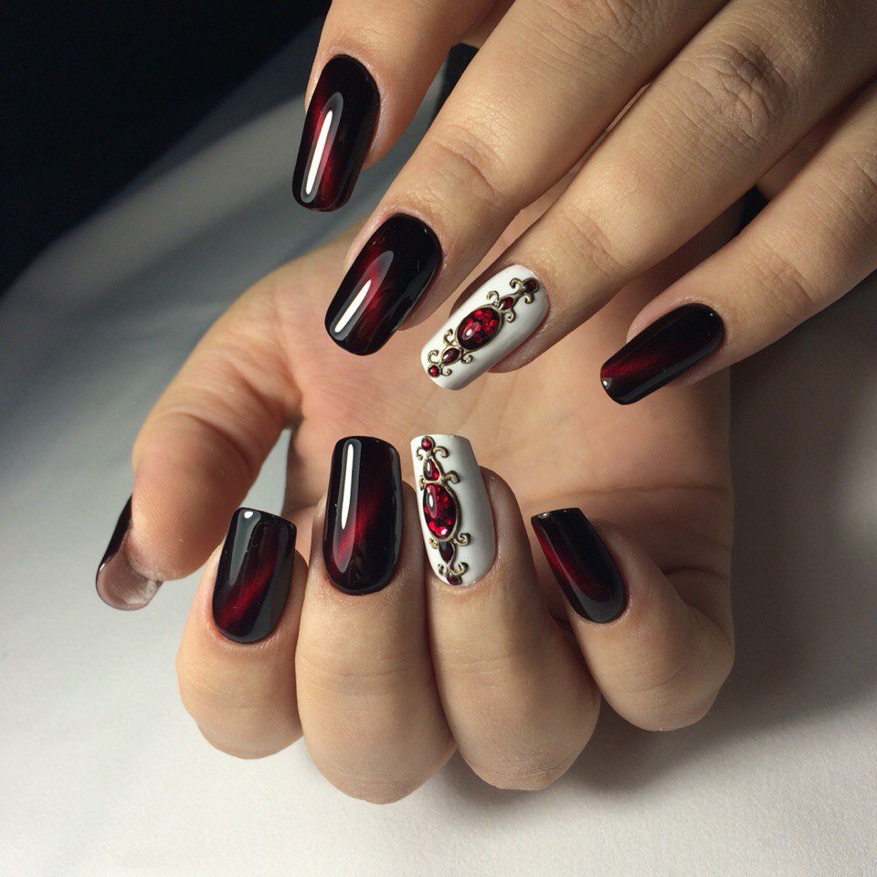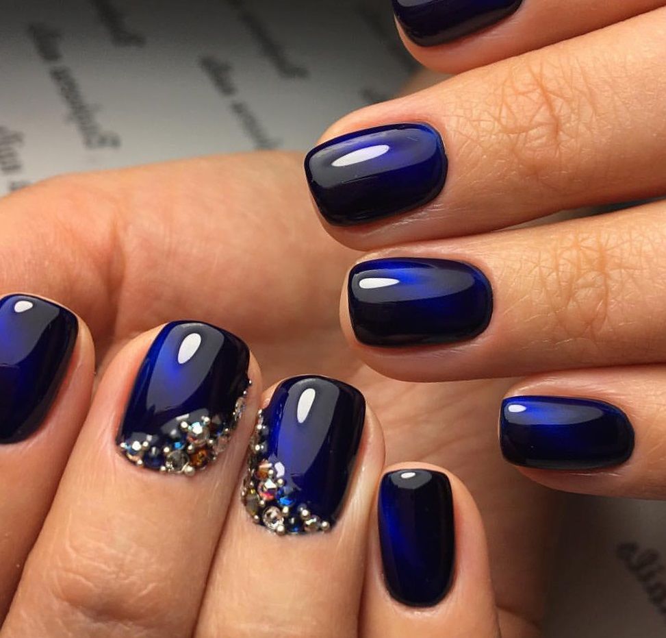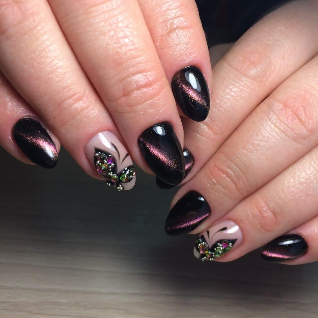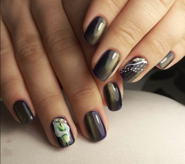 Modern nail masters have improved and expanded the possibilities of nail design with a magnetic gel. A popular manicure with a bottomless overflow has become a platform for subsequent decoration. Now it serves as a link between fashion trends. Below we show you options for a cat's eye with drawings of animals, plants, with sparkles and stones. Elements with 3D effect and glitter are also used. Matte and moonlight manicure with pearls and stones. The use of elemental abstraction on several nails and gradient transitions.