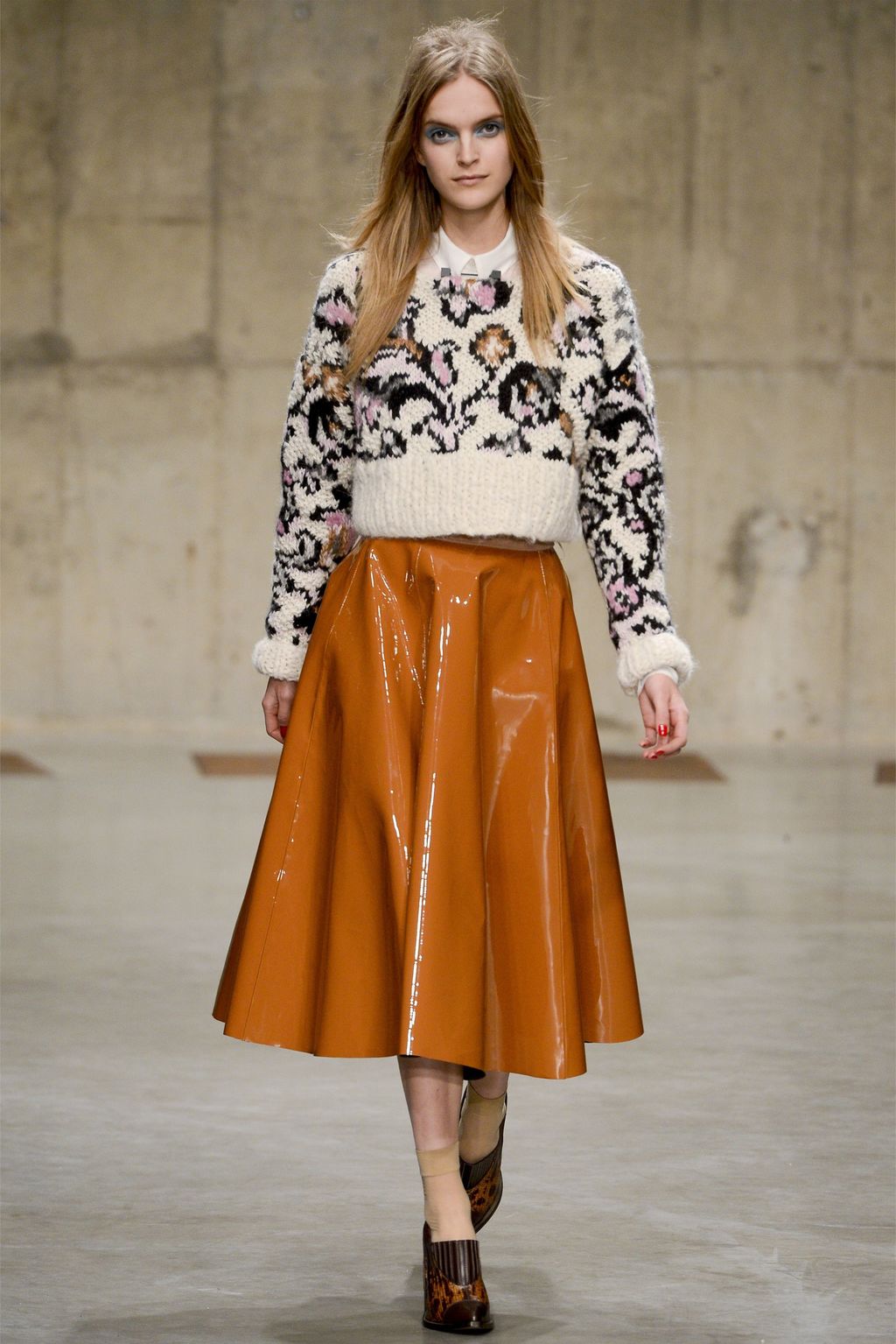 - Skirts made of leather - such a style of skirts has long conquered the main catwalks around the world. And this season, stylists took care of women with not very perfect legs and created skirts of universal length, slightly covering the knees. Leather skirts very effectively fit the figure, and in combination with a beautiful knitted sweater, they look warm and cozy.