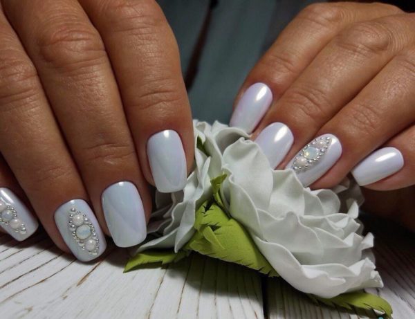 Rubbed manicure is a relatively new direction and therefore nail designers have the opportunity to develop and delight us with fresh ideas for the virtuoso combination of different techniques with pearls, rhinestones, paintings and other decoration attributes.
