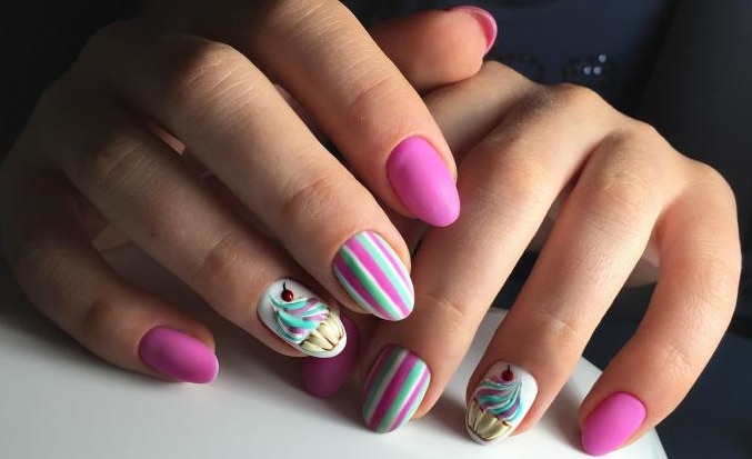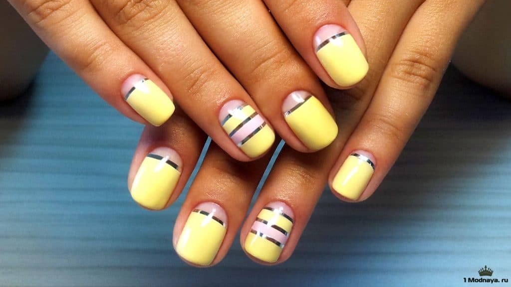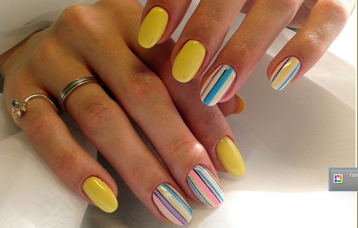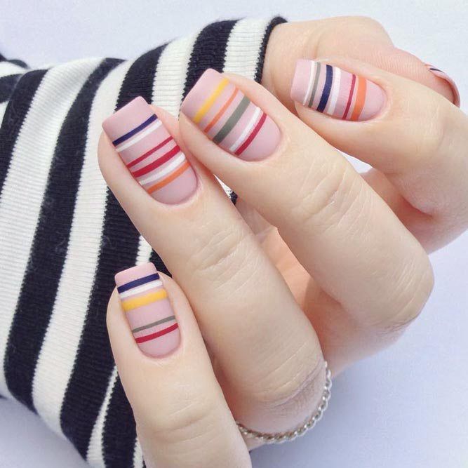 Lightweight and cute art design. The strips can be a tone darker or lighter than the base, instead of varnish, you can use sparkles, colored decorative tape or acrylic powder. You can also add a picture to one of the nails.