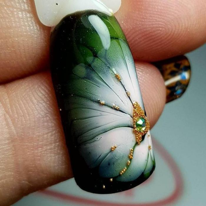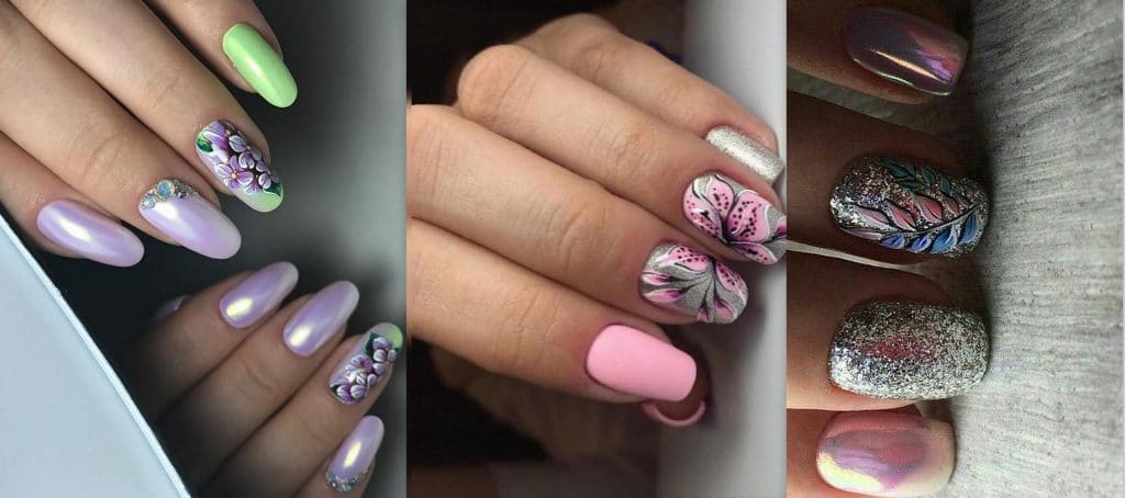 Floral design is not in fashion. He is always popular and fresh. In combination with a mirror rubbing, it acquires softness and tenderness. And if you use large sparkles as the basis, we get an interesting and harmonious design solution.