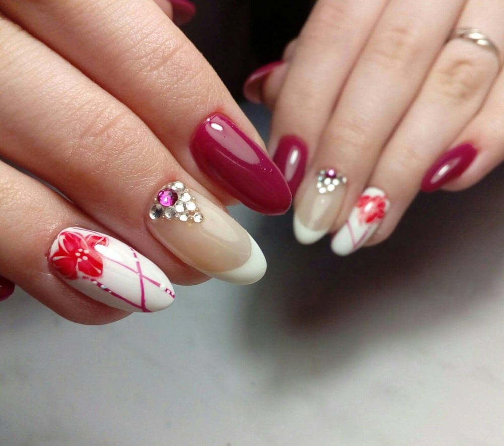 Sophisticated design, but a knowledgeable master will not cause problems. And with proper training, you yourself can control it. This pattern is complemented with rhinestones and sparkles and is often applied to only one hand.