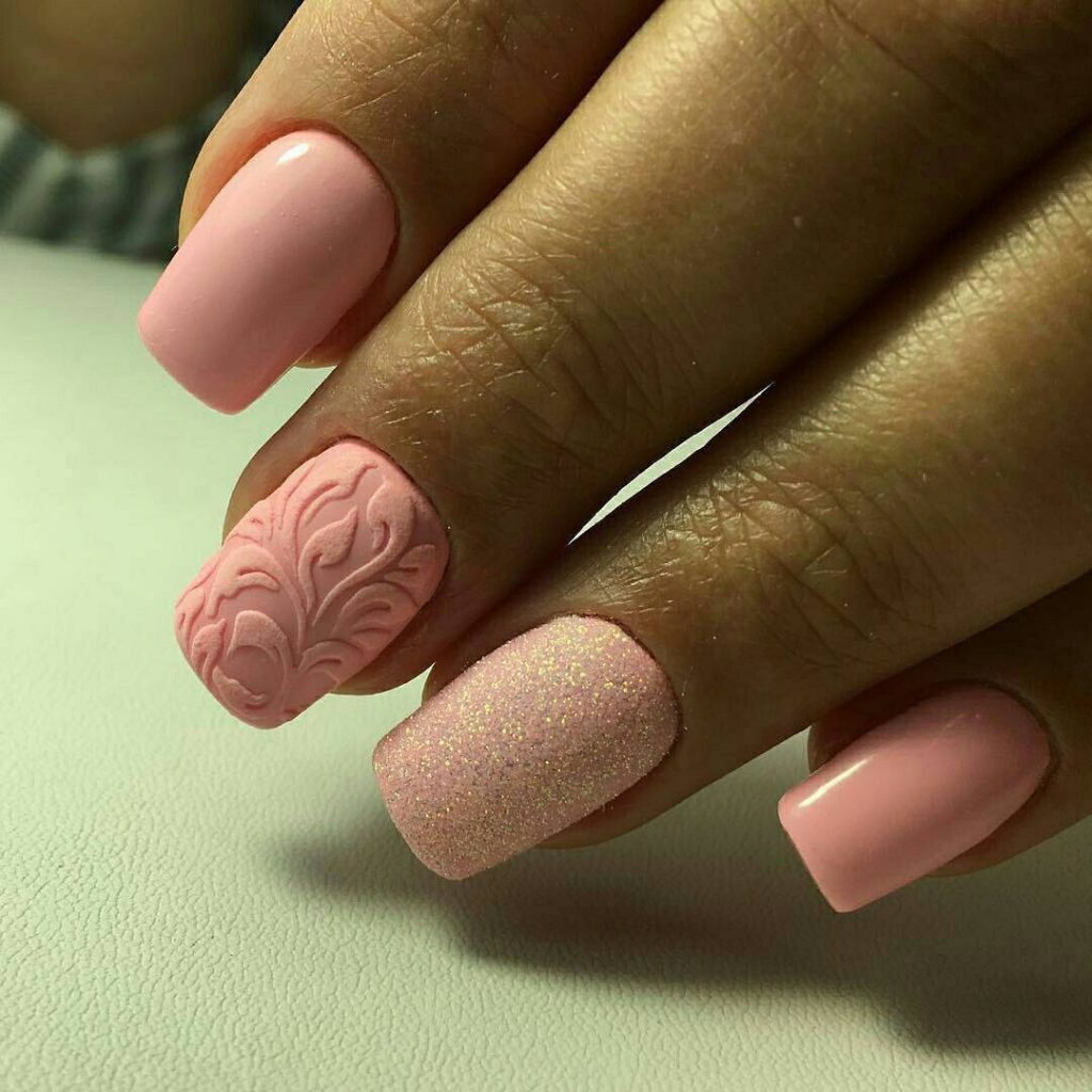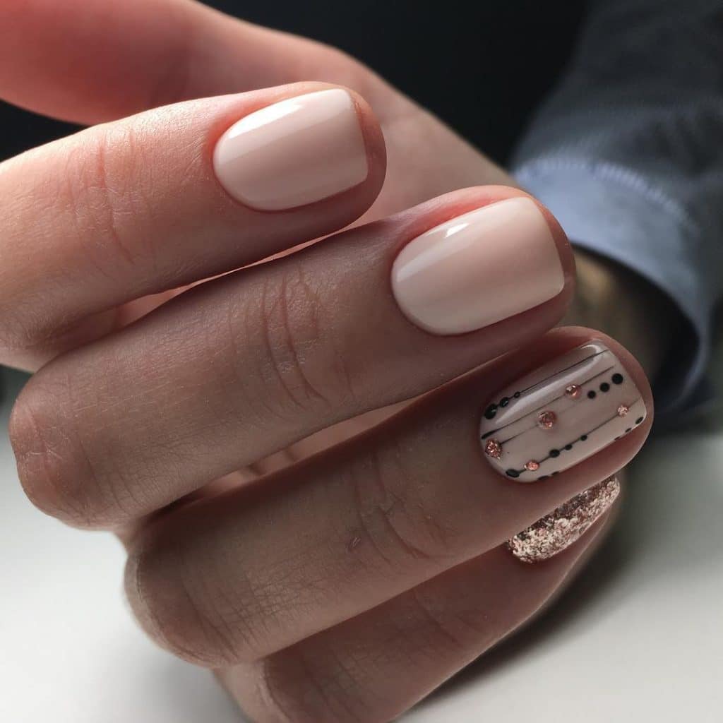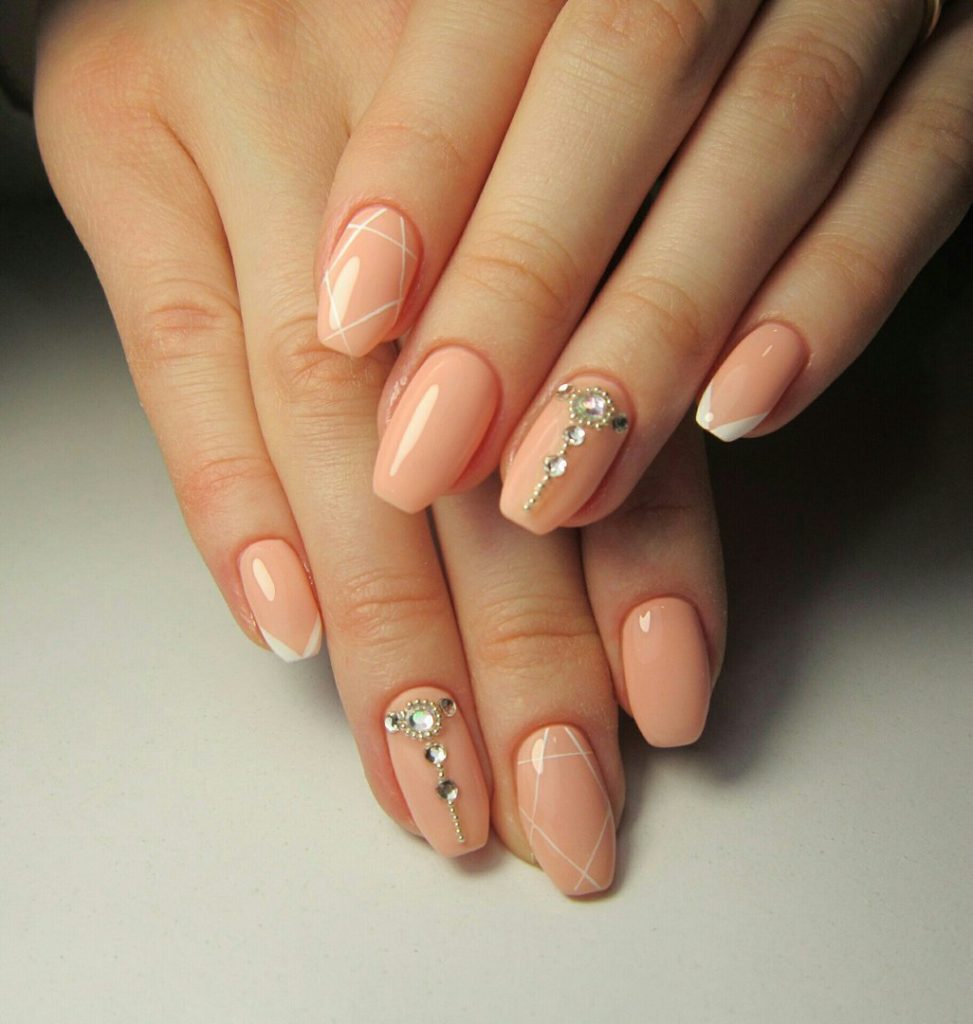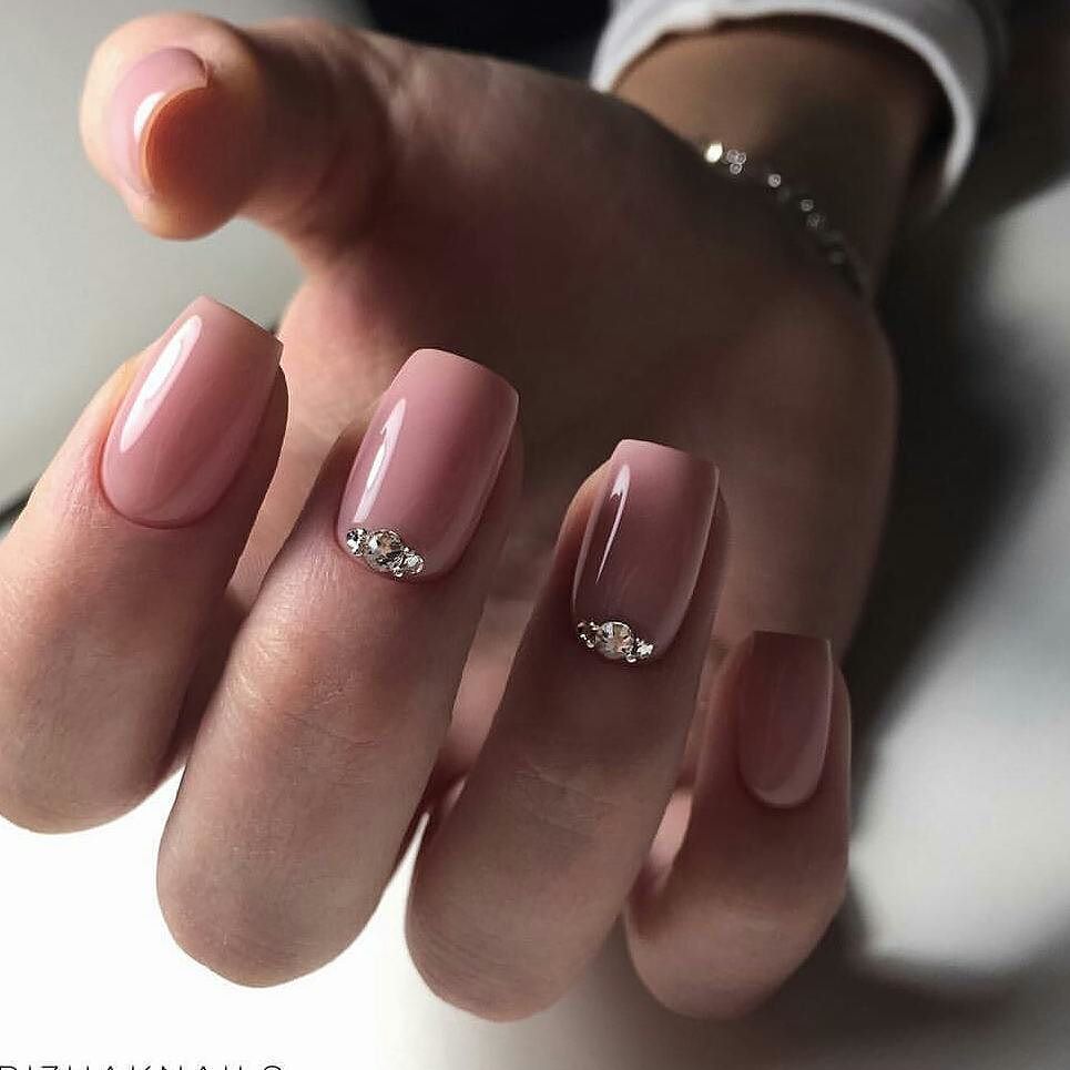 - Nude manicure is absolutely universal. With him, you can safely go to work, and to school, and for a romantic walk. Adding a little rhinestone or sparkles to the nude design, you can safely go to meet the most important holiday in your life.