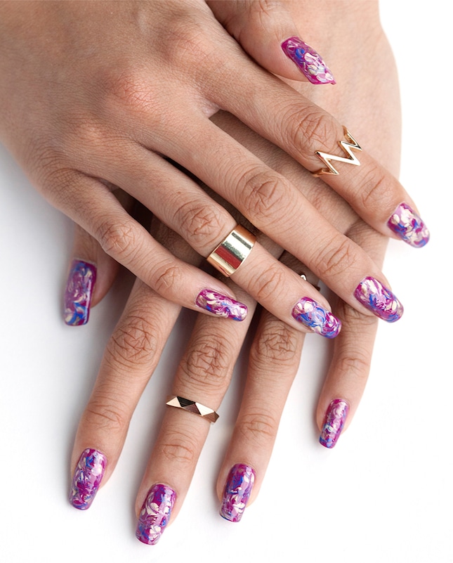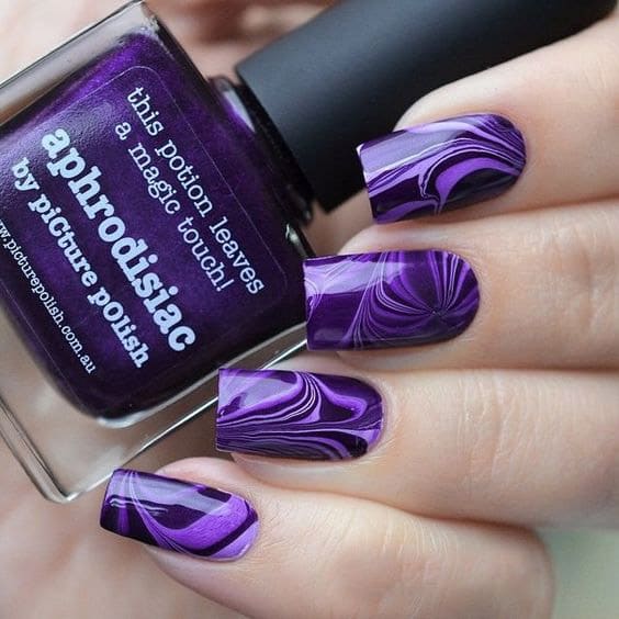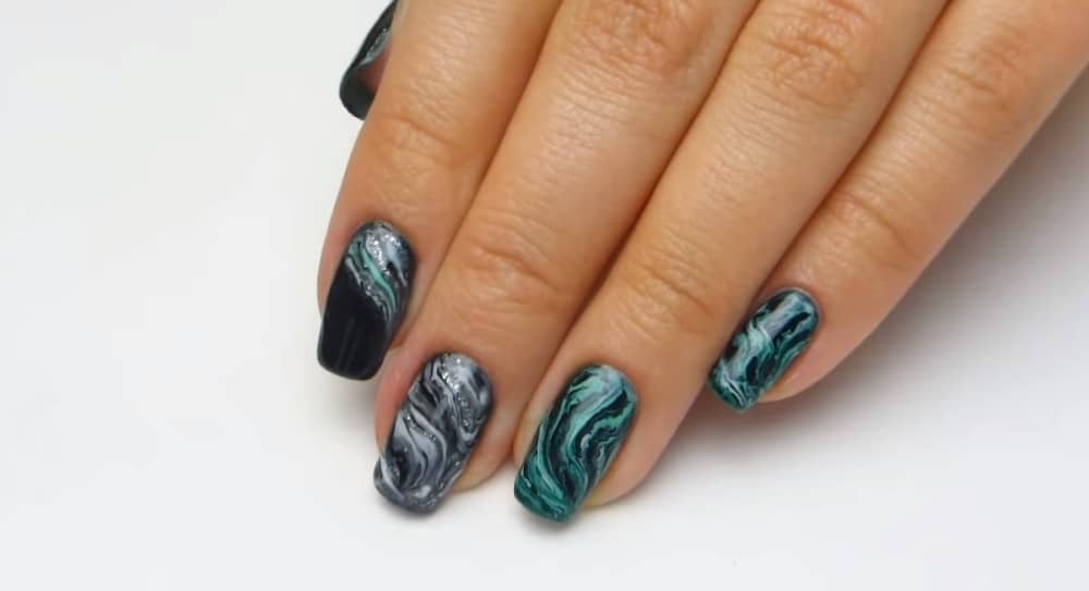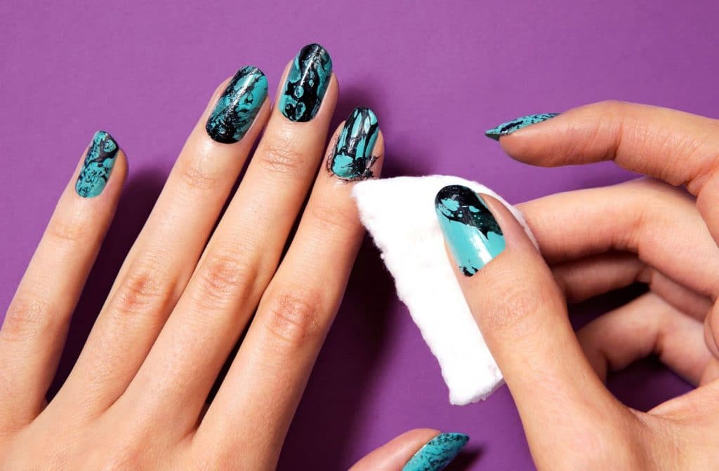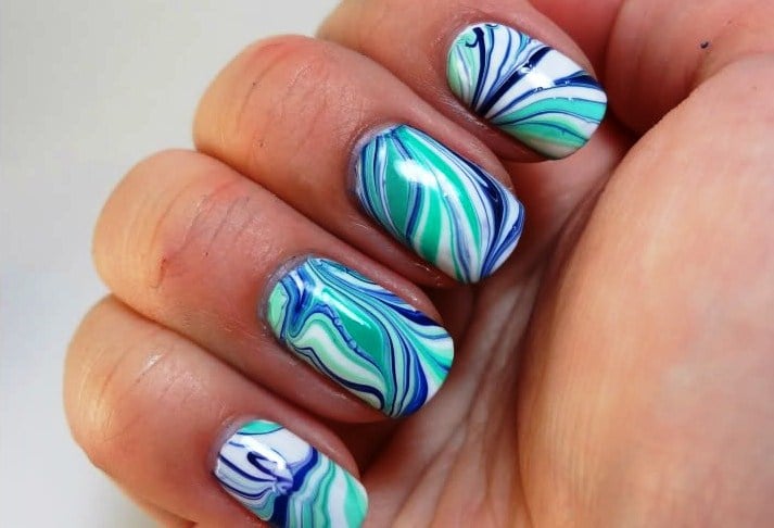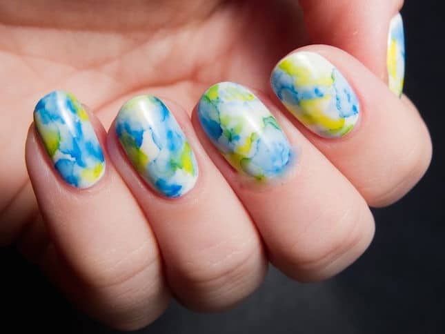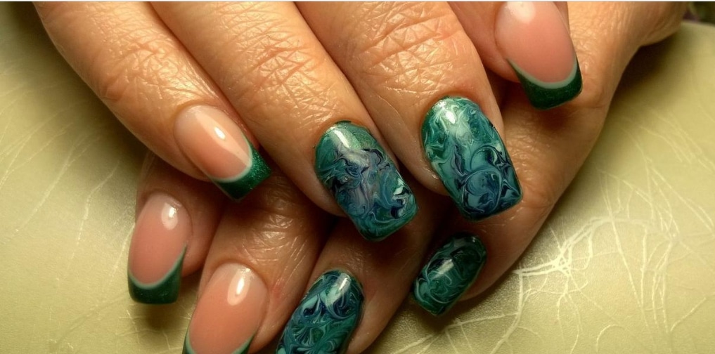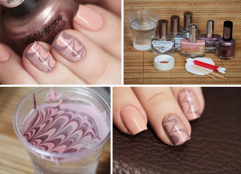 We prepare the nails and apply the base color. In a container of water with a room of temperature, alternately drip several varnishes chosen by us. Using a toothpick we create the desired pattern. Next, in turn, lower each finger into the mixture. The area around the nail can be protected with tape, greasy cream, or use a liquid tape for manicure. If there is nothing at hand, simply clean with a cotton swab dipped in acetone.
