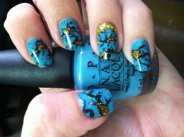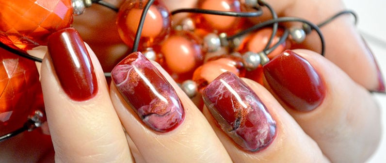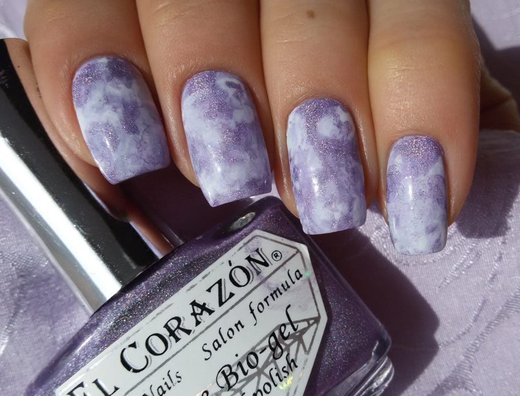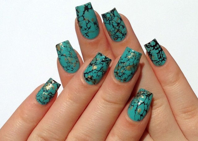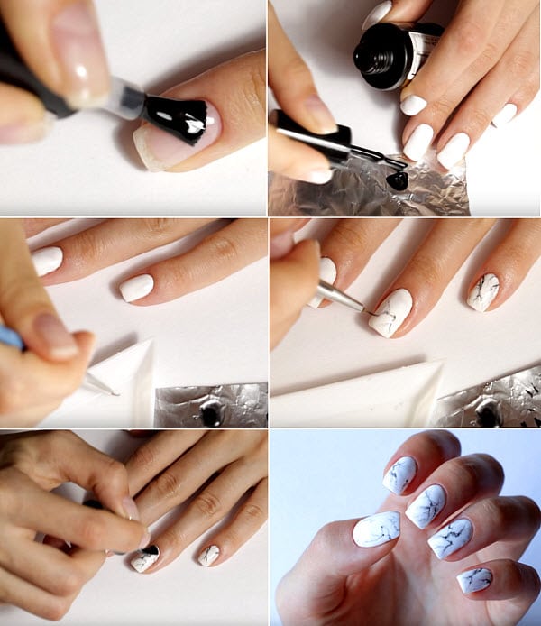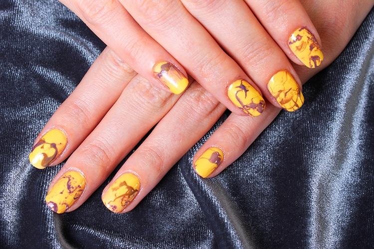 We clean the nail plate with a buff and apply a primer. After we apply the base, dry and stain it in the main color. On the second layer of colored varnish we drip a small amount of varnish and with the help of a thin brush we draw curves, but smooth lines. Lines can be blurred with tops for more reliable copying of the pattern on marble. The resulting pattern is dried in a lamp and fixed with a top.
