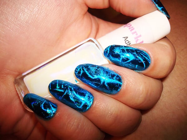 On the prepared nails, apply the main color, allow to dry. Next, apply the second layer of varnish of a different color and gently crumpled a piece of film with abrupt movements, soak the top layer. The oiled part of the varnish will open the base layer - this is what we need! We remove the film, clean the side rollers and fix the resulting pattern.