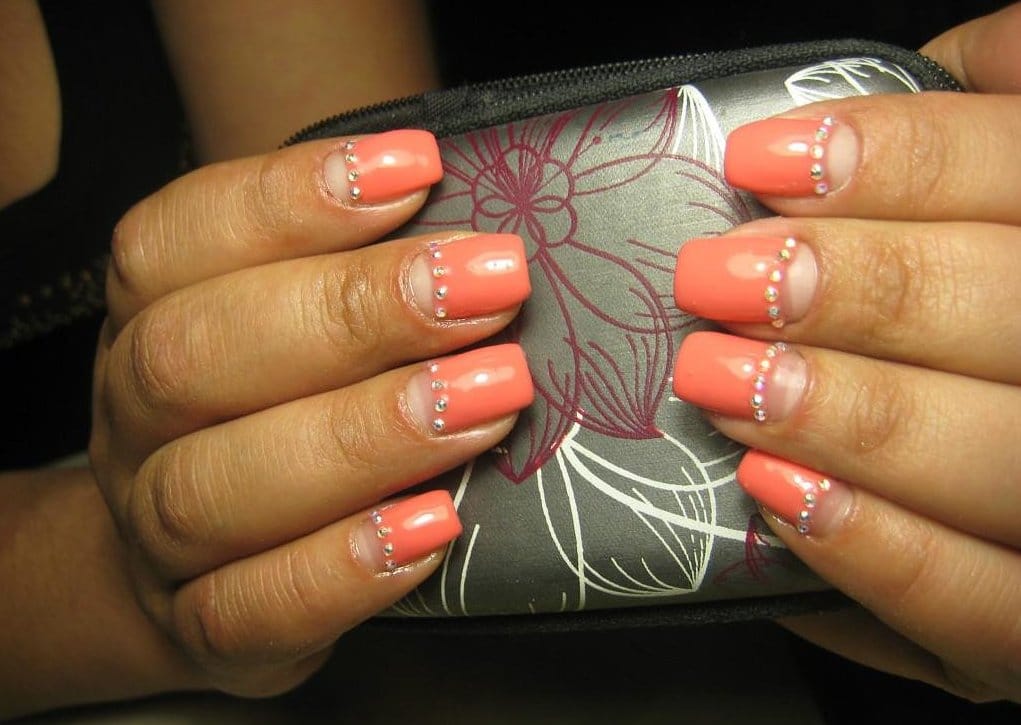 Rhinestones - Everyone knows this word. Brilliant, beautiful, they turn any cover into a holiday. Rhinestones are highly regarded in all for their amazing ability to reflect light. Rhinestones combined with coral color will make your look even more attractive.