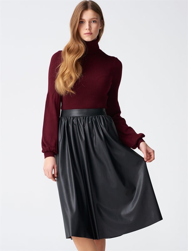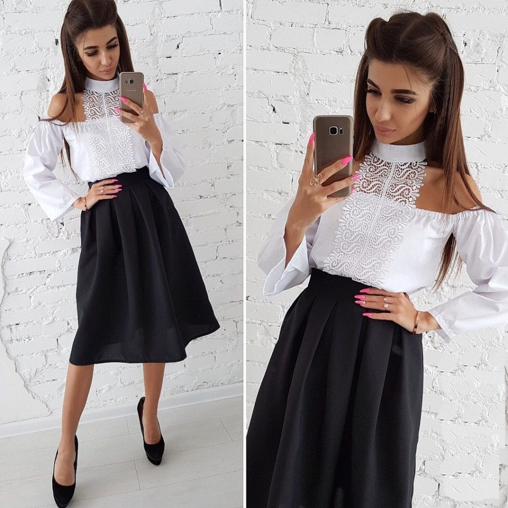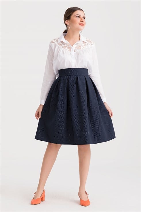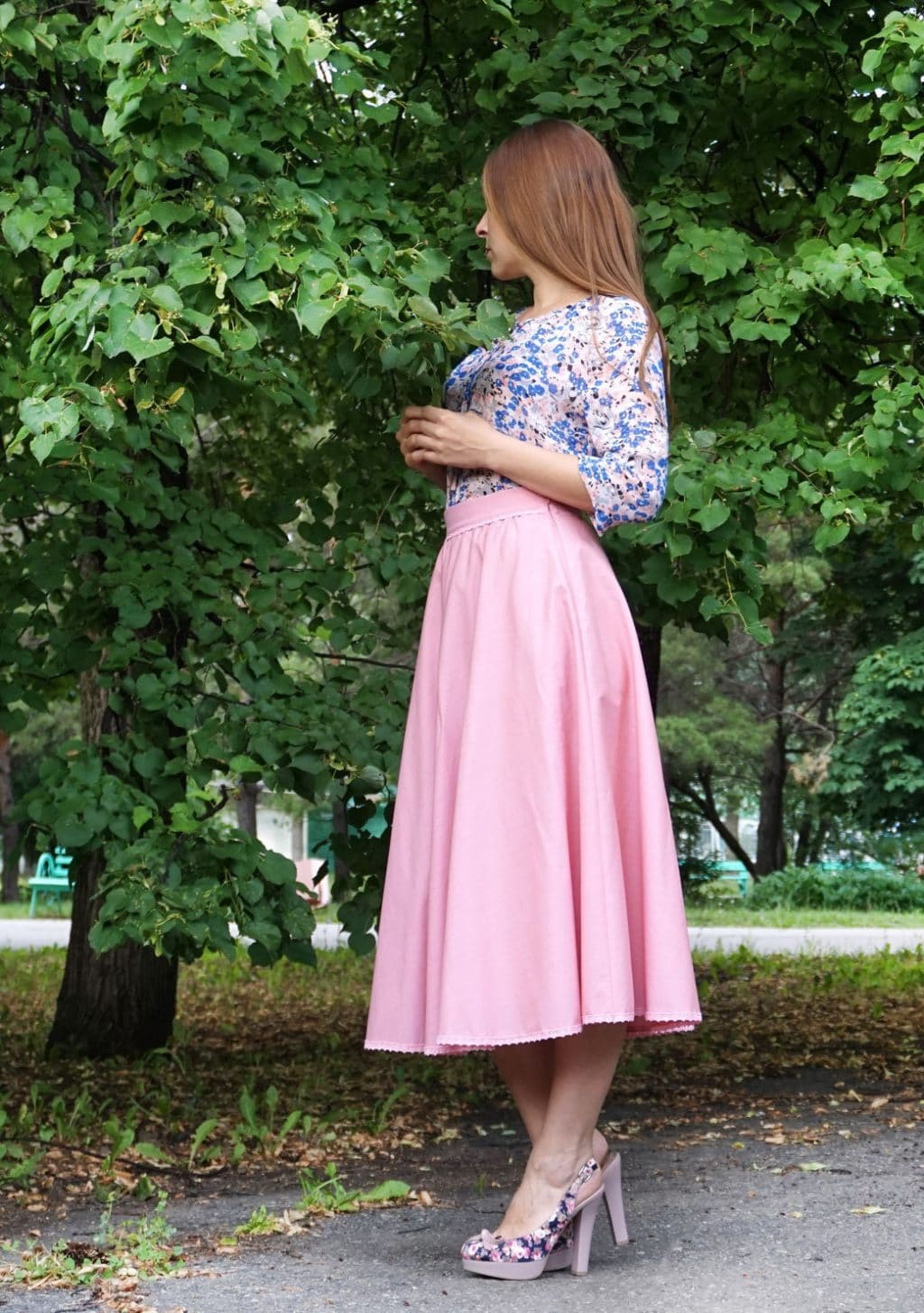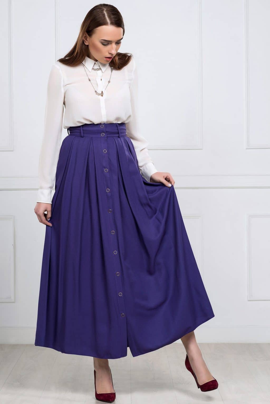 A wide skirt in combination with a business blouse harmonizes well creating an excellent well-groomed image.