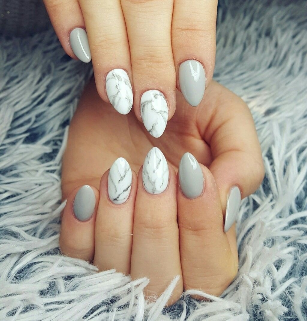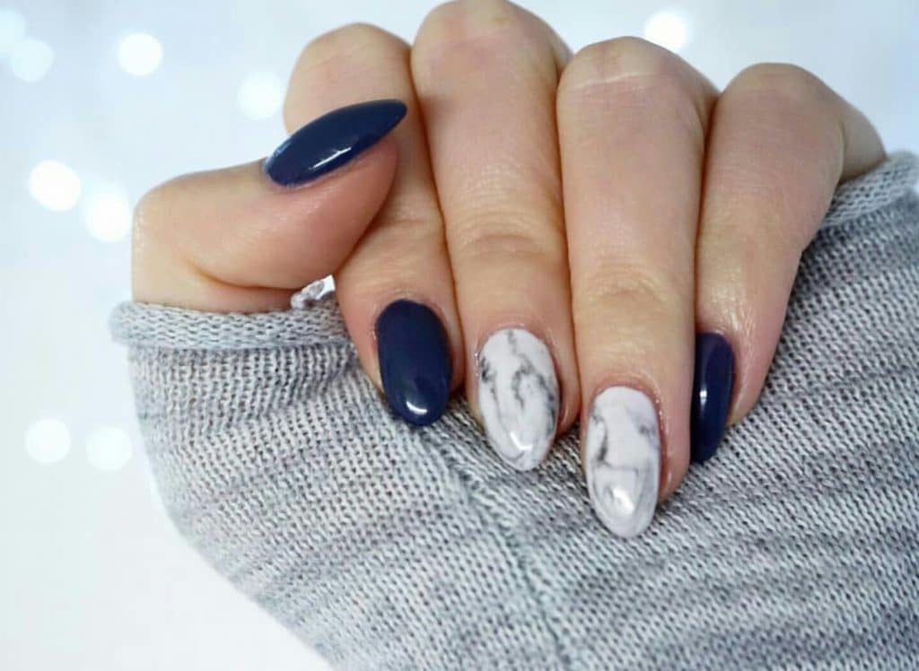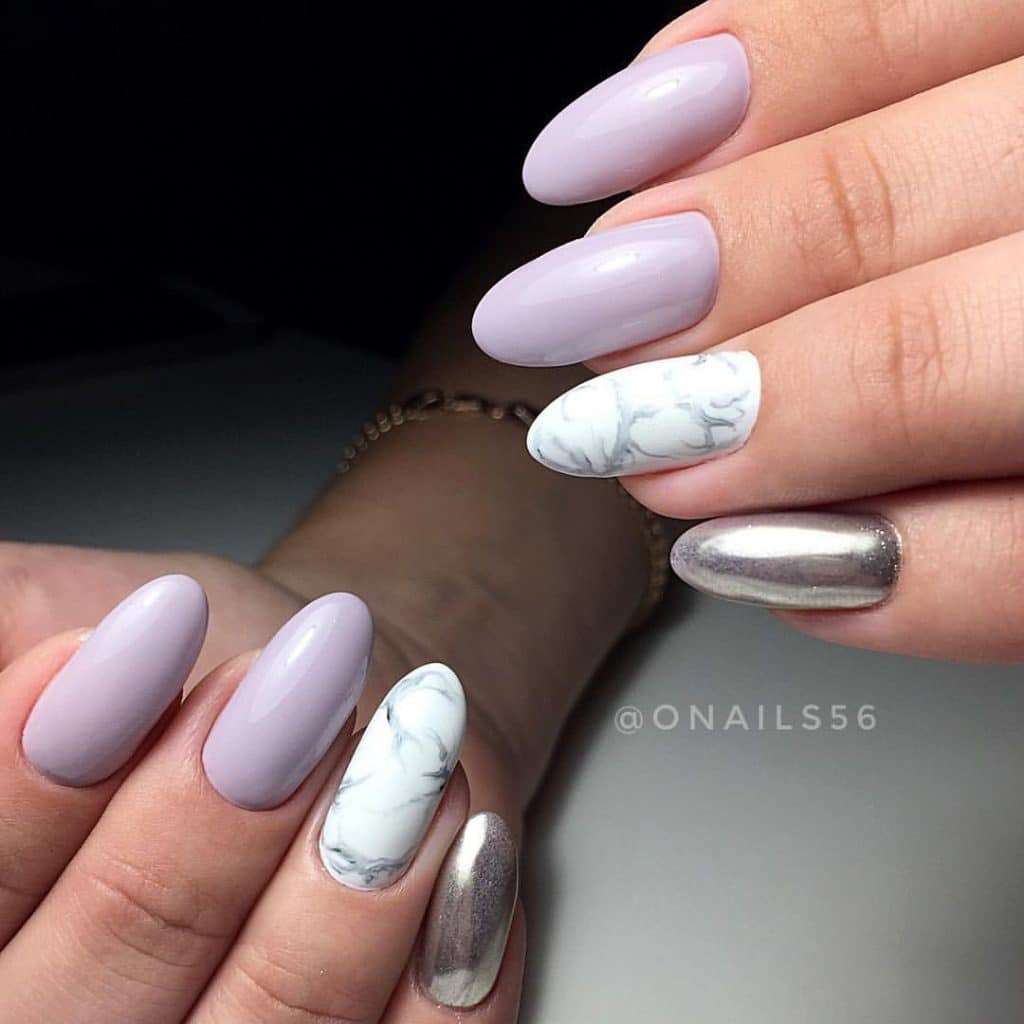 Marble design has gained particular popularity recently. However, in view of their effectiveness, girls do not tire of repeating it on their nails again and again. Such a manicure is performed by mixing two colors and drawing on a white basis stains, reminiscent of the structure of marble.