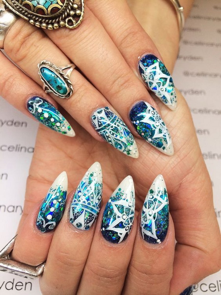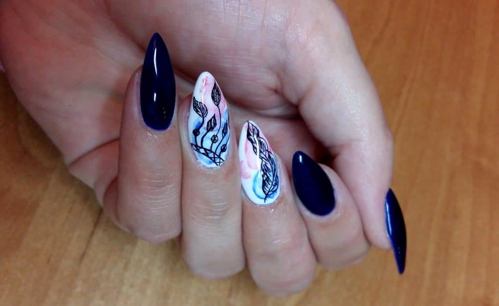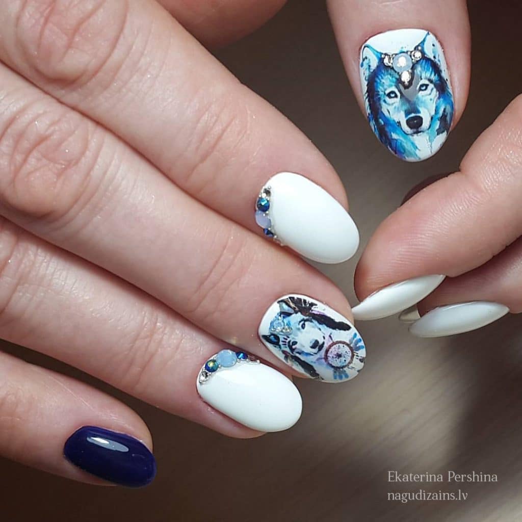 Girls who want to stand out from the crowd should pay attention to manicure with ethnic motives. It can be various patterns, drawings and even painting under Khokhloma! Often on such nails drawings of dream catchers and similar motives may be present.
