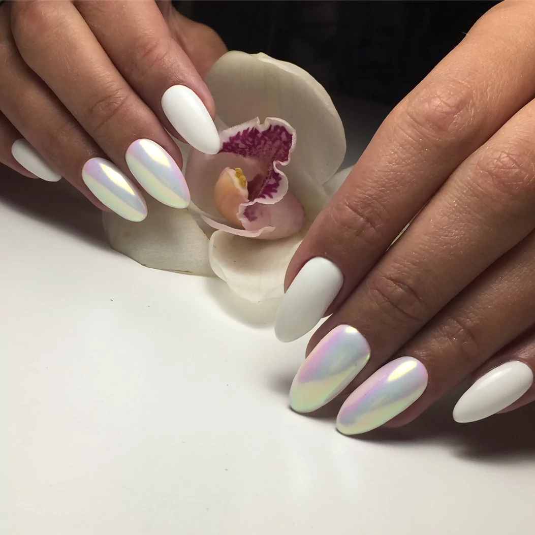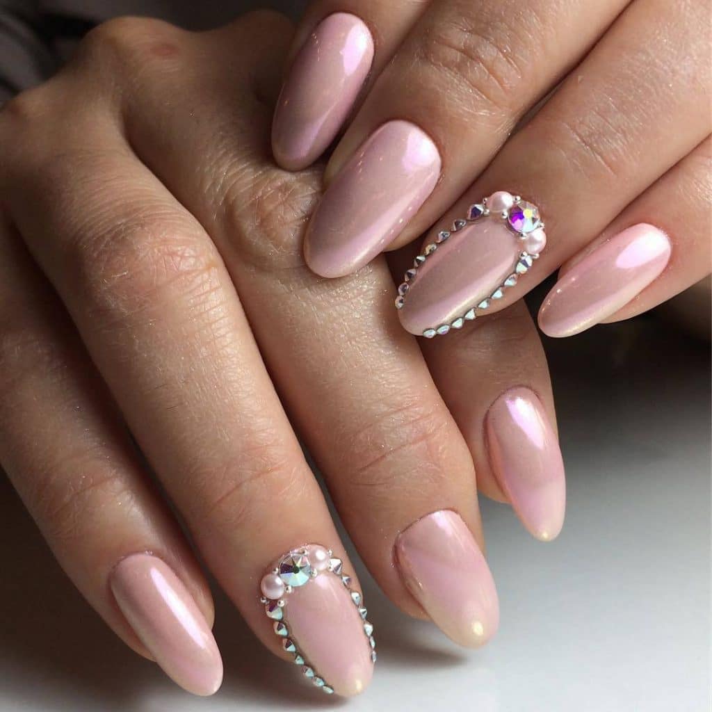 Pearl shades in manicure look very gentle and beautiful. Basically, they are preferred at any celebration. Pearl lacquer in wedding design of nails looks very luxurious.