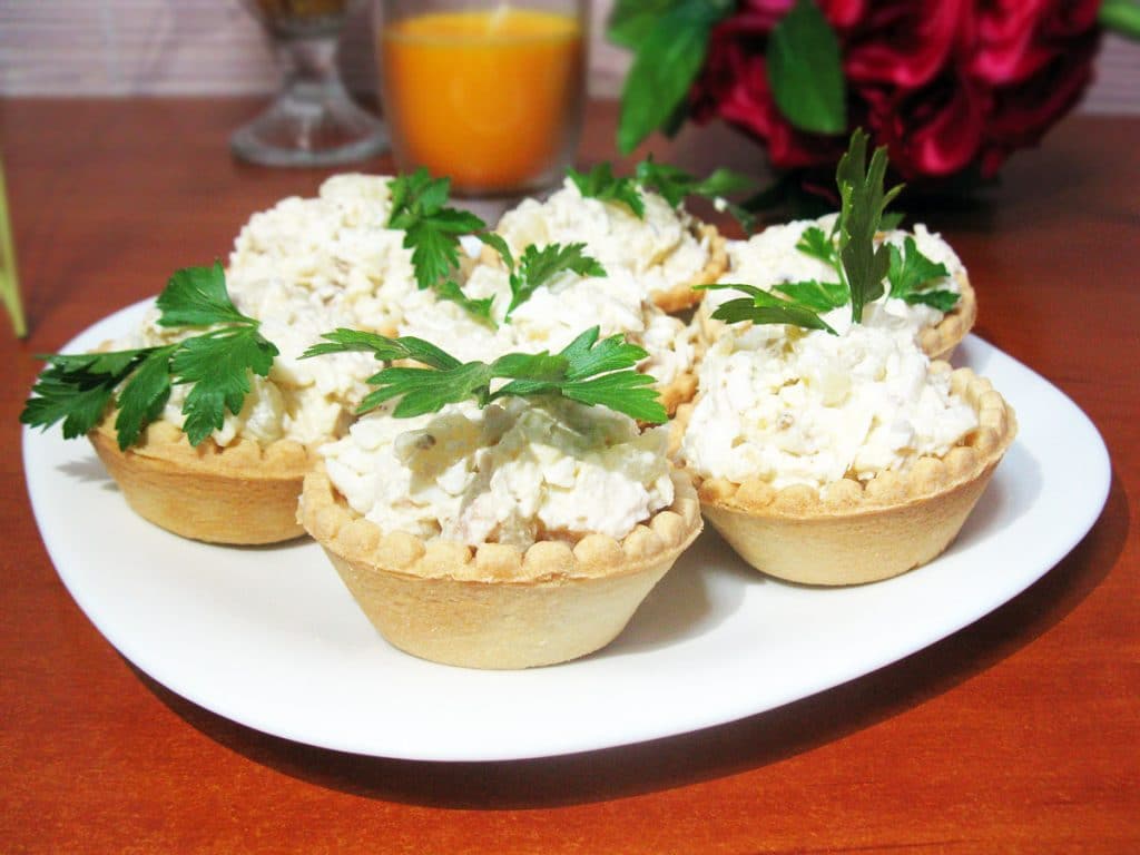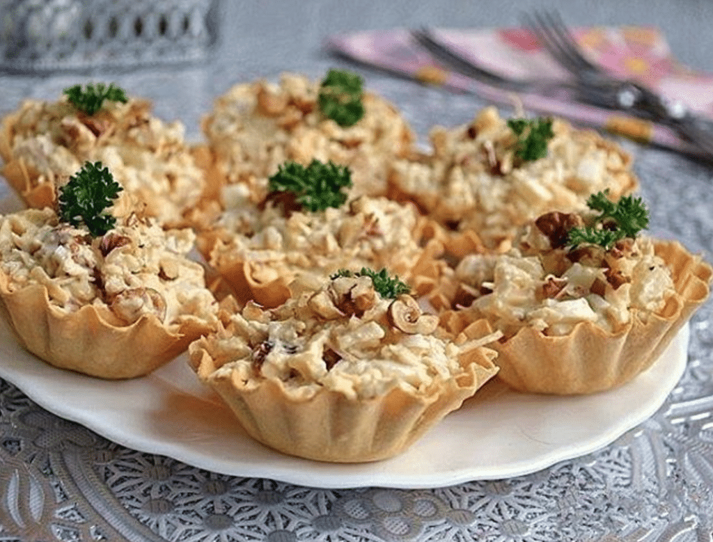 Another wonderful snack on the New Year's table will be tartlets. Tartlets can be stuffed with almost anything. Our New Year tartlets will be stuffed with chicken and pineapple with walnuts. Light and at the same time satisfying snack.