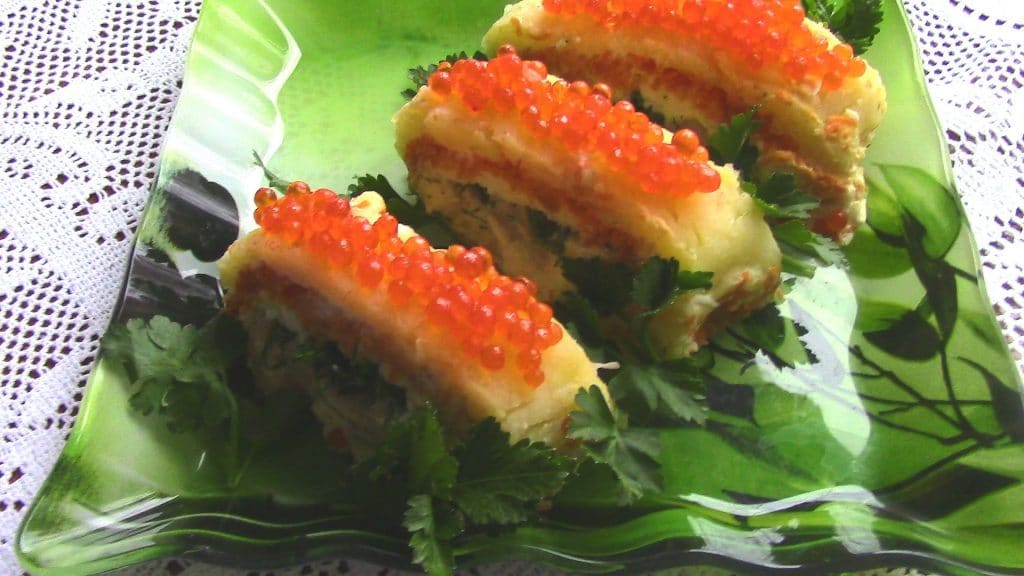 This salad can be prepared not only in the form of a roll, but also as a regular puff. To do this, put chopped salmon and dill at the very bottom, and lay out the further ingredients in the reverse order.