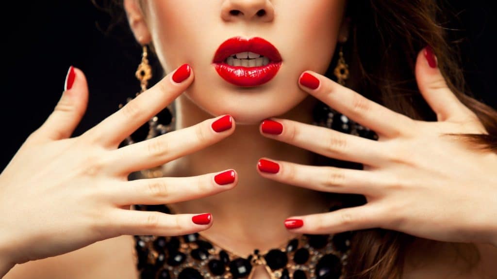 Red spectrum. It goes well with black and white, gray, brown, blue. Clothing or its elements are better to choose the same color with red varnish, their mismatch is a gross blunder in the image.