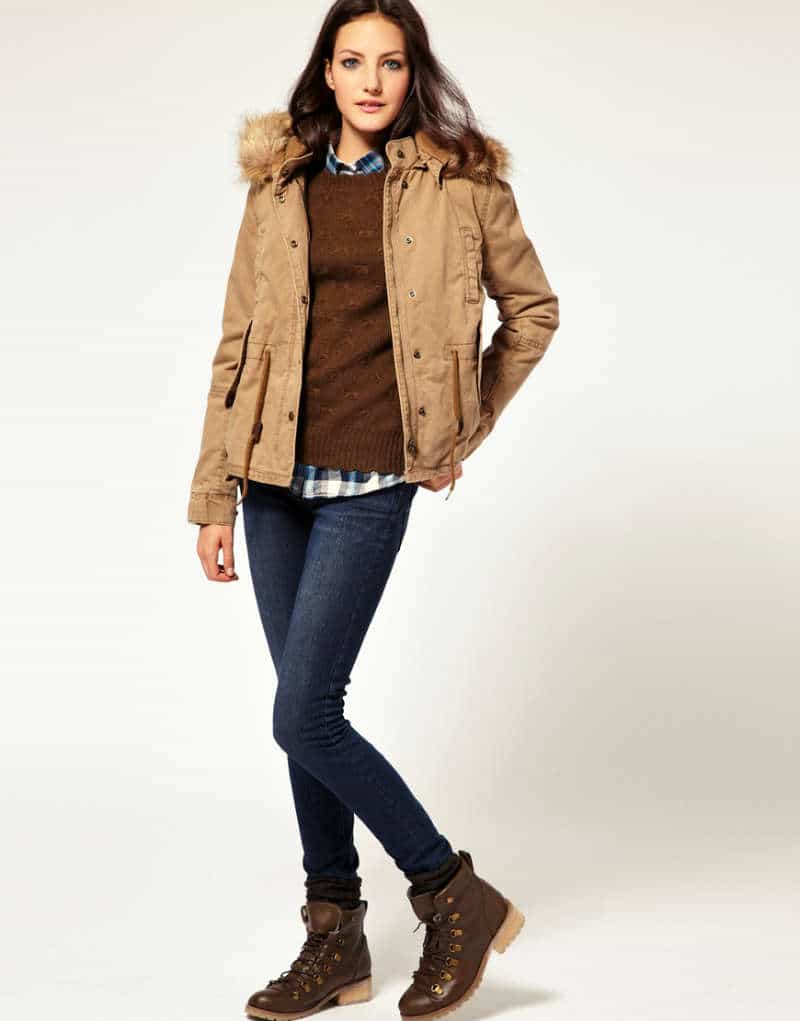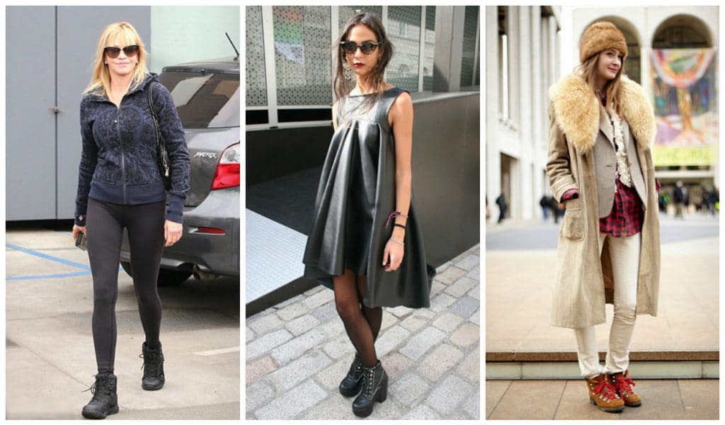 With hikers, it is good to combine khaki pants, a light sweater and a jacket. The combination with leather, loose-fitting dresses, matching leggings will also be a good solution.