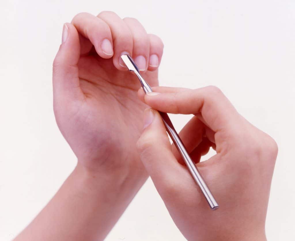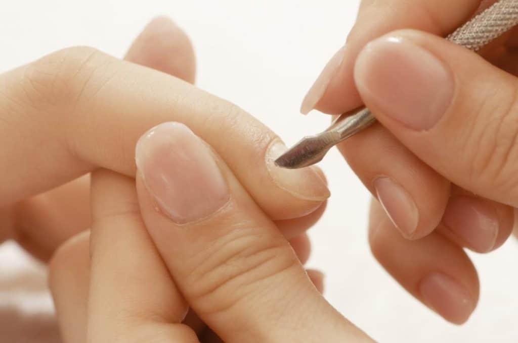 The cuticle is removed with tweezers. To do this, the procedure of steaming the nails in the bath with sea salt and essential oil is carried out. After the spatula, the side rollers are cleaned and the cuticle is pushed back. Next, the keratinized skin is cut with nippers.