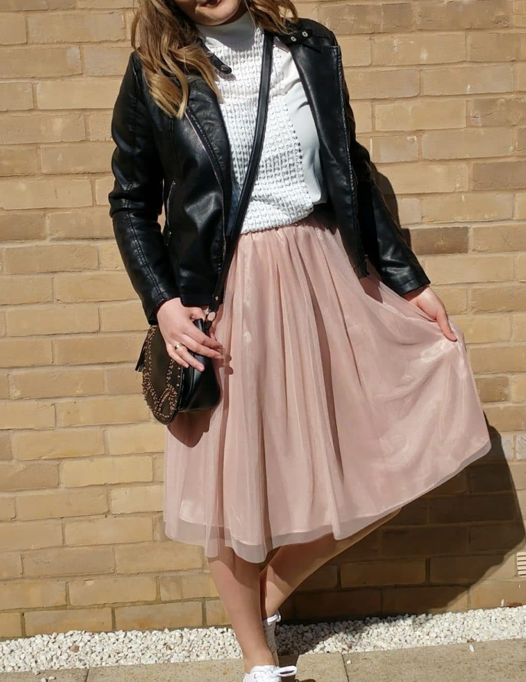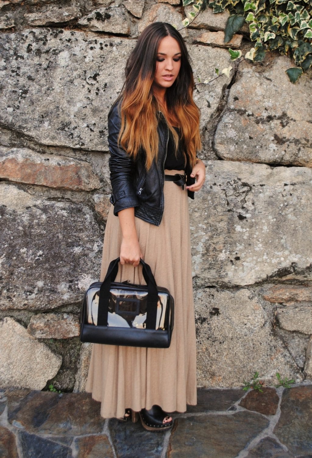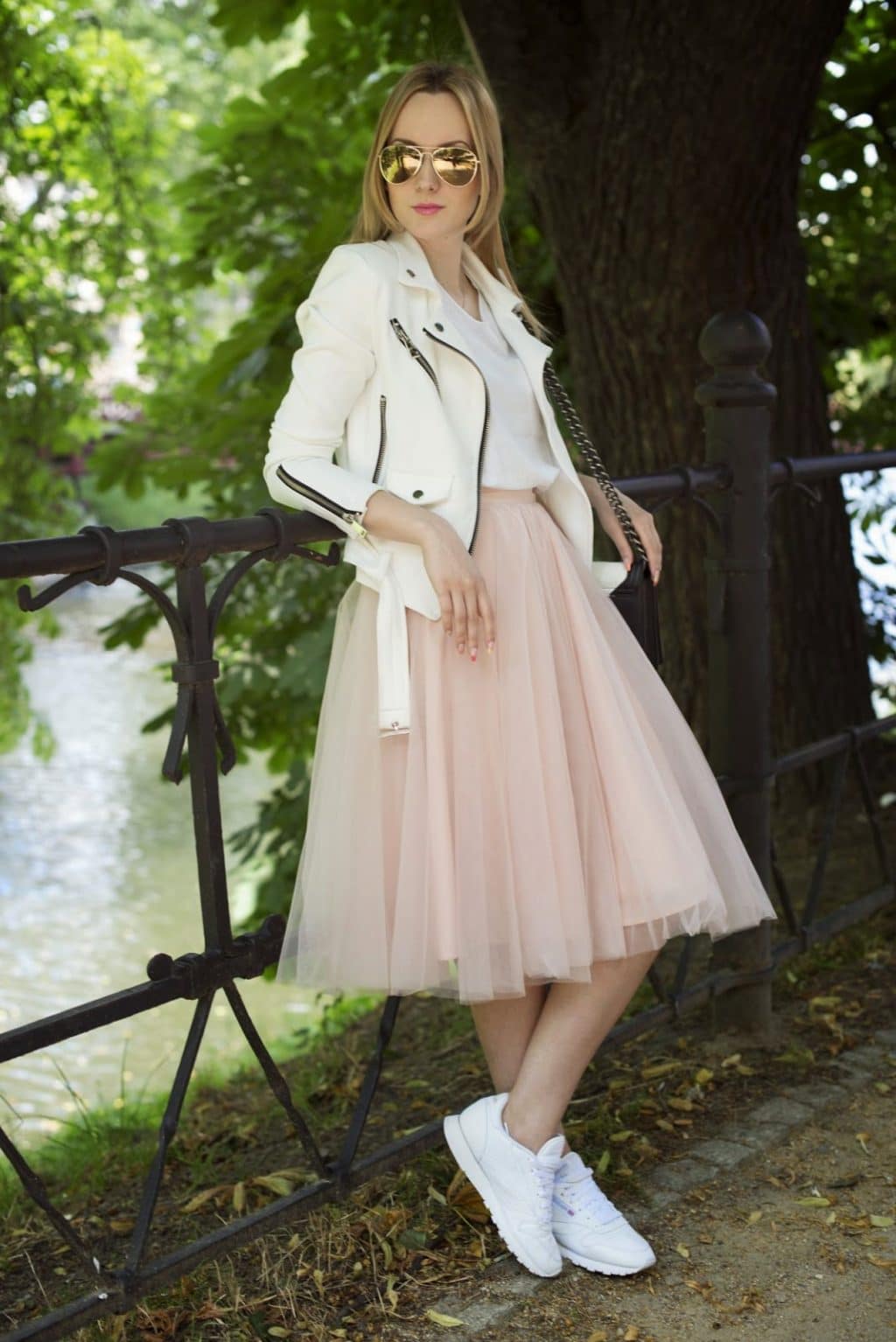 More massive shoes on the platform must be expertly selected for a beige skirt. Because excess rudeness can ruin your image.