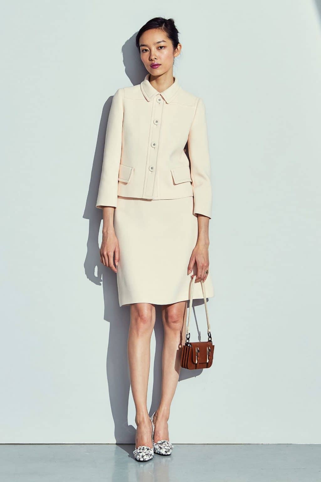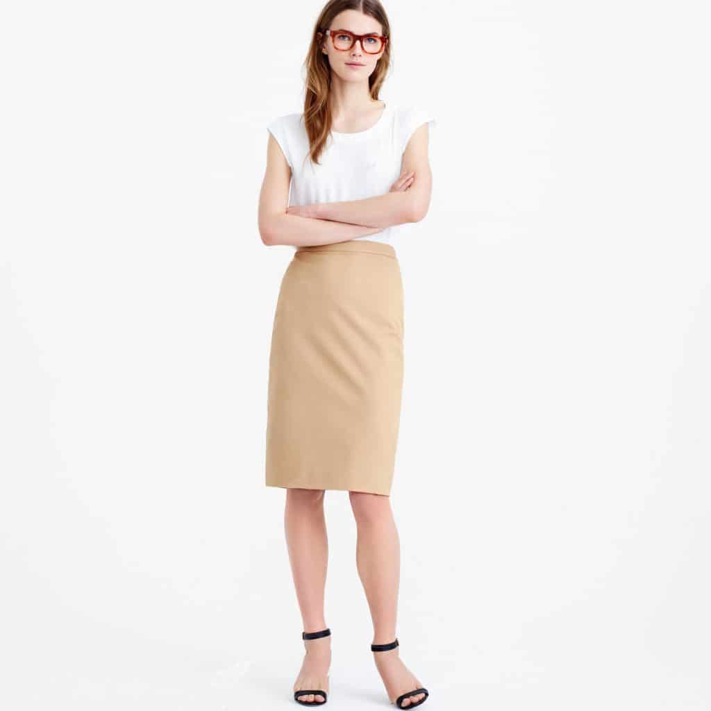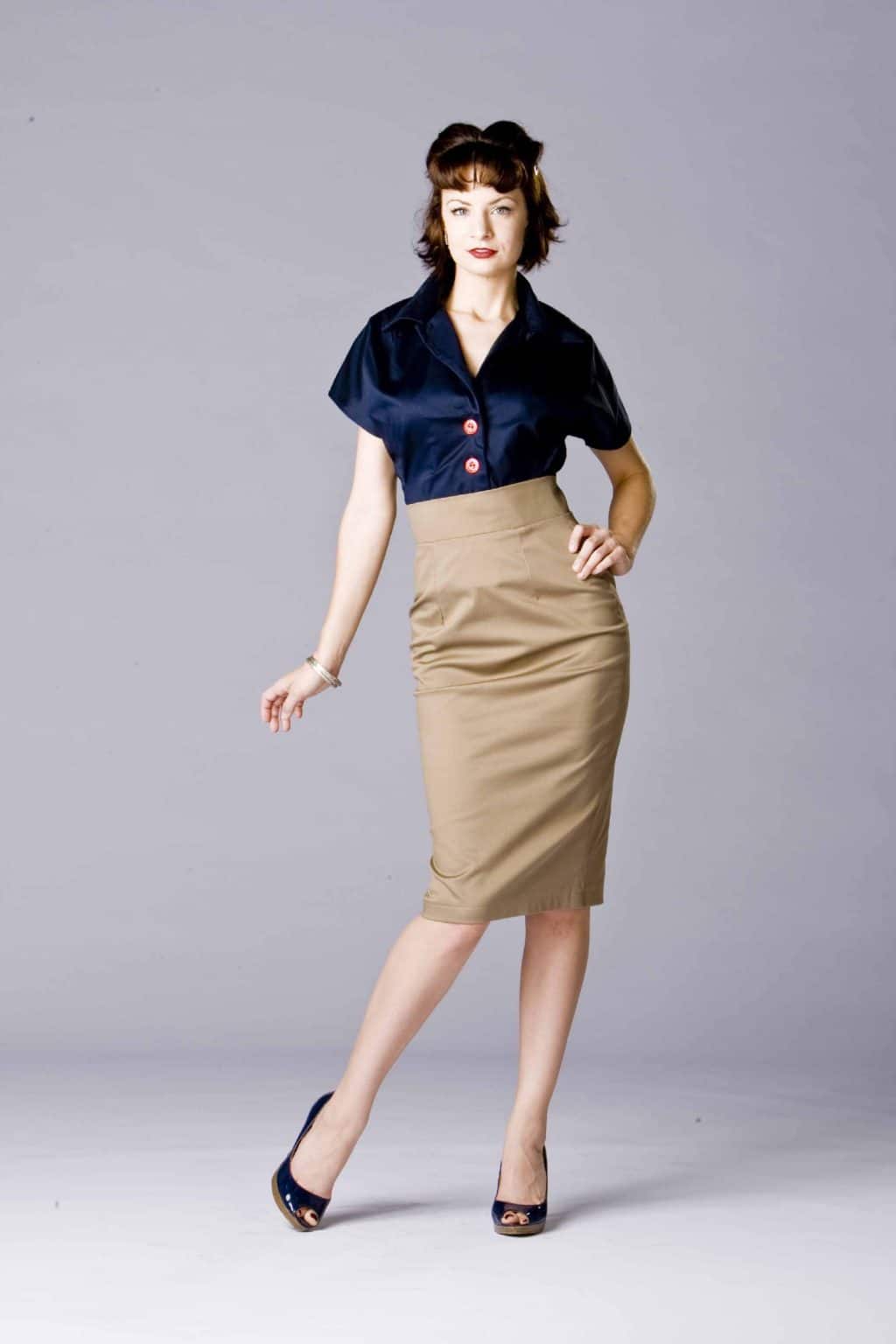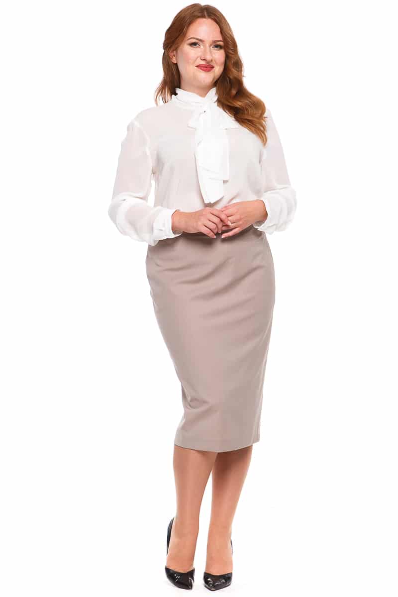 The standard version of a pencil skirt and blouse is an icon of the classic style.