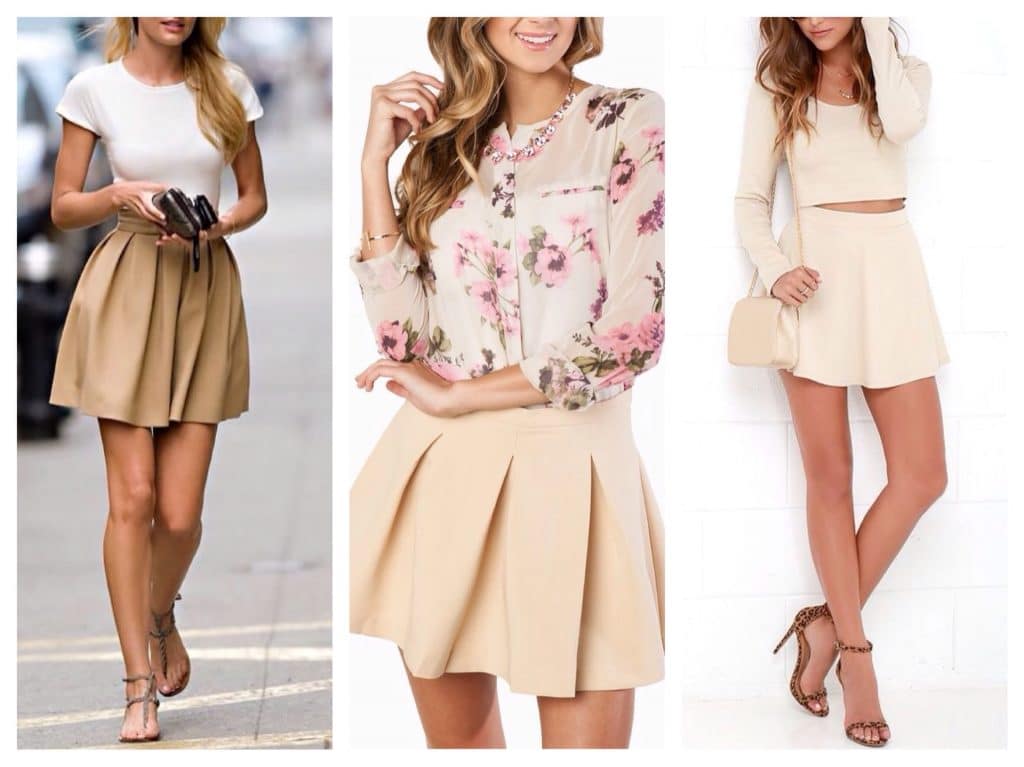 To create a light image, you can combine a beige skirt with summer T-shirts.
